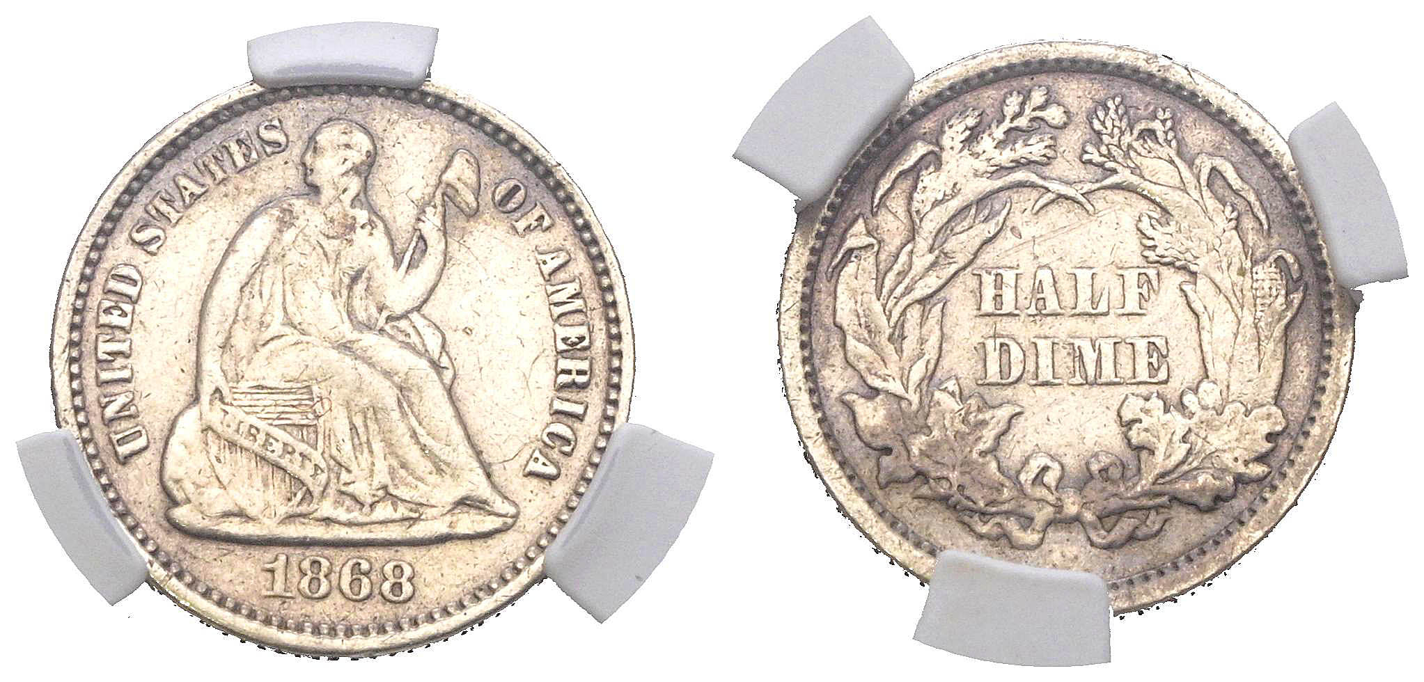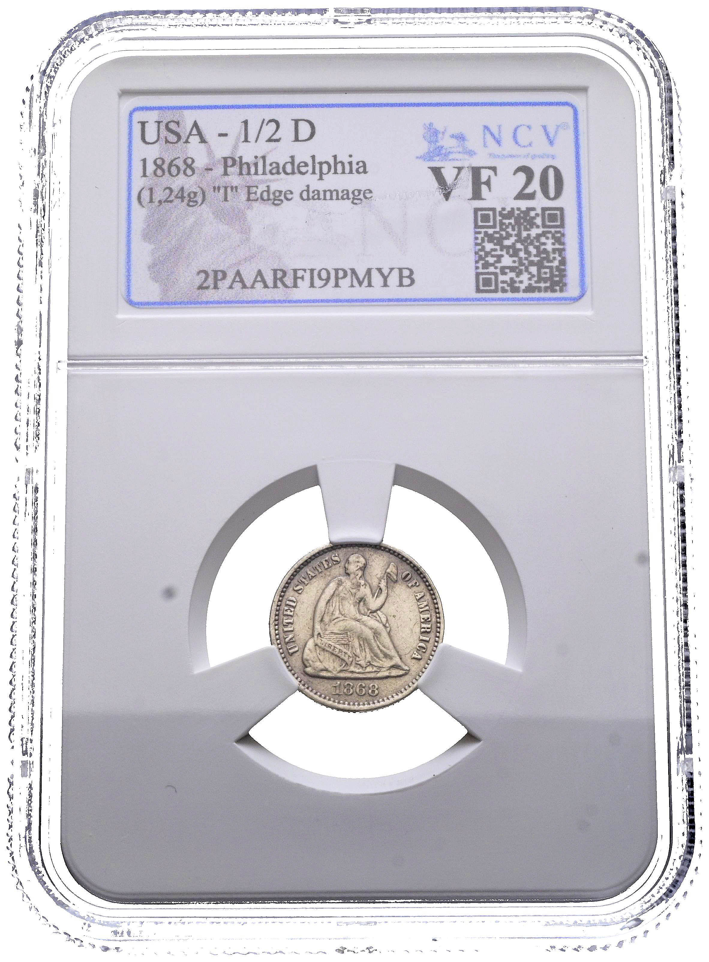 UNITED STATES. 1/2 Dime. (Ar. 1.24g/15mm). 1868. Philadelphia. (Km#91). Seated Liberty. Encapsulated by NCV VF 20. Scarce, mintage of 88,600.
