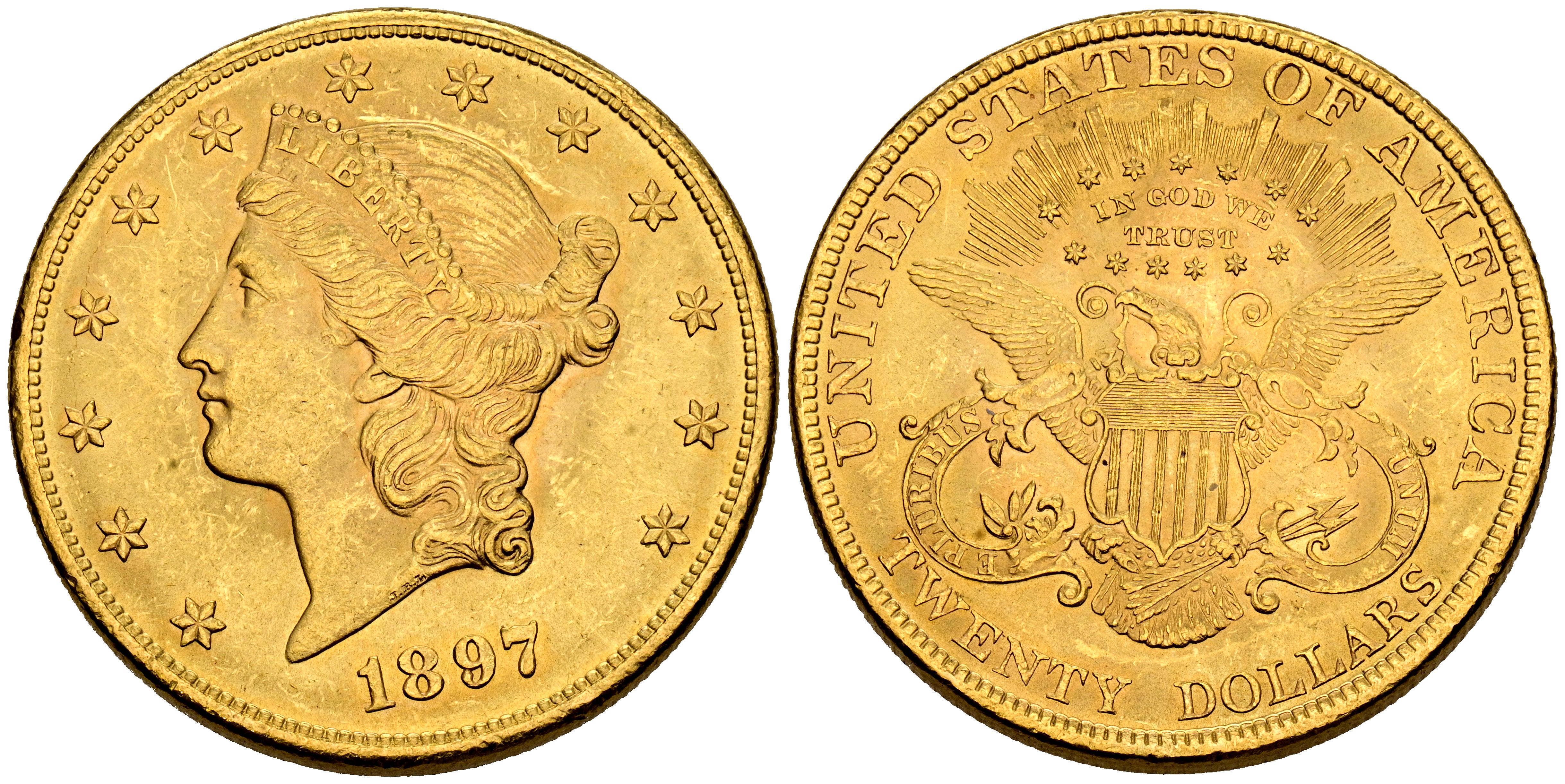 UNITED STATES. 20 Dollars. (Au. 33.43g/34mm). 1897. Philadelphia. (Km#74.3). VF+.