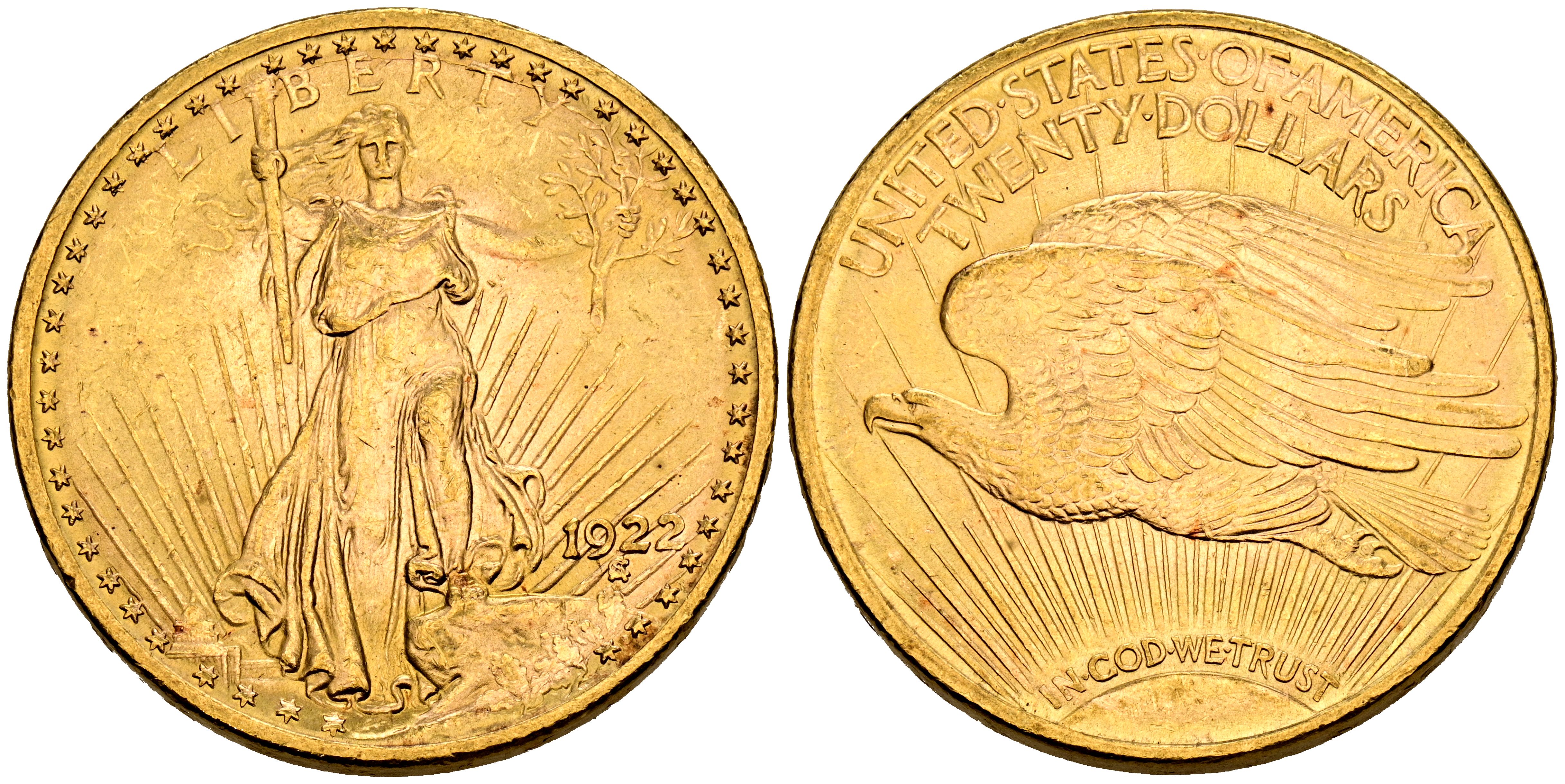 UNITED STATES. 20 Dollars. (Au. 33.43g/34mm). 1922. Philadelphia. (Km#131). VF+.