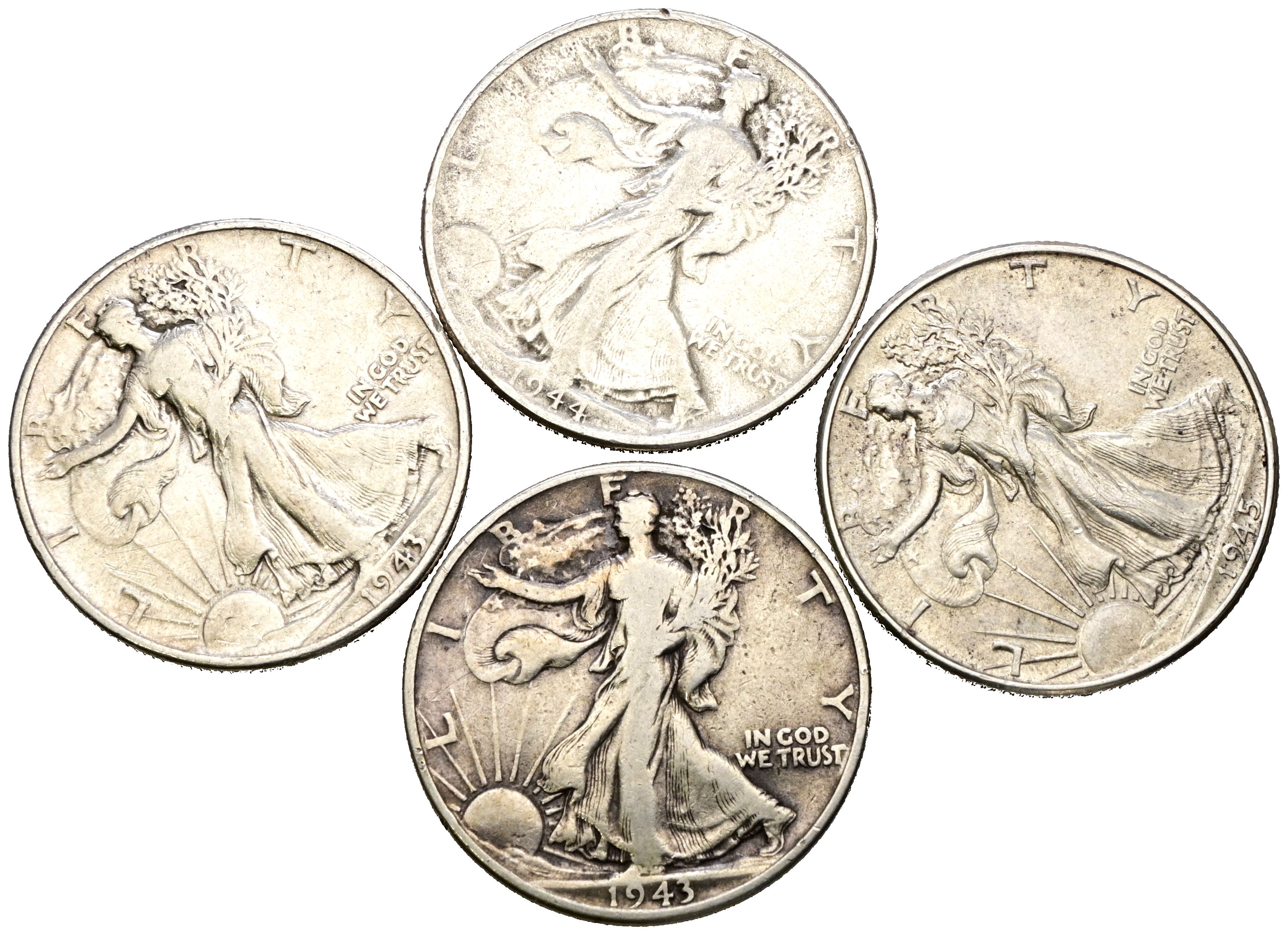 UNITED STATES. Set of four silver half-dollar coins. Struck by the 1943, 1944, and 1945 mintage. Varying states of preservation. FOR EXAMINATION.