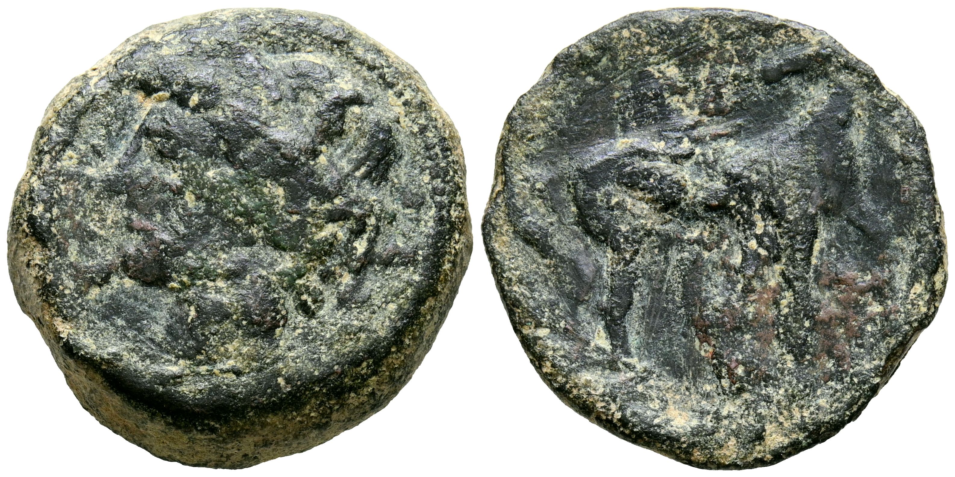 English CARTAGONOVA (Cartagena, Murcia). Half Calque. (Ae. 7.52g/22mm). 220-215 Fine (FAB-507). Obv: Head of Tanit facing left. Rev: Standing horse facing right, palm tree behind. VF-.