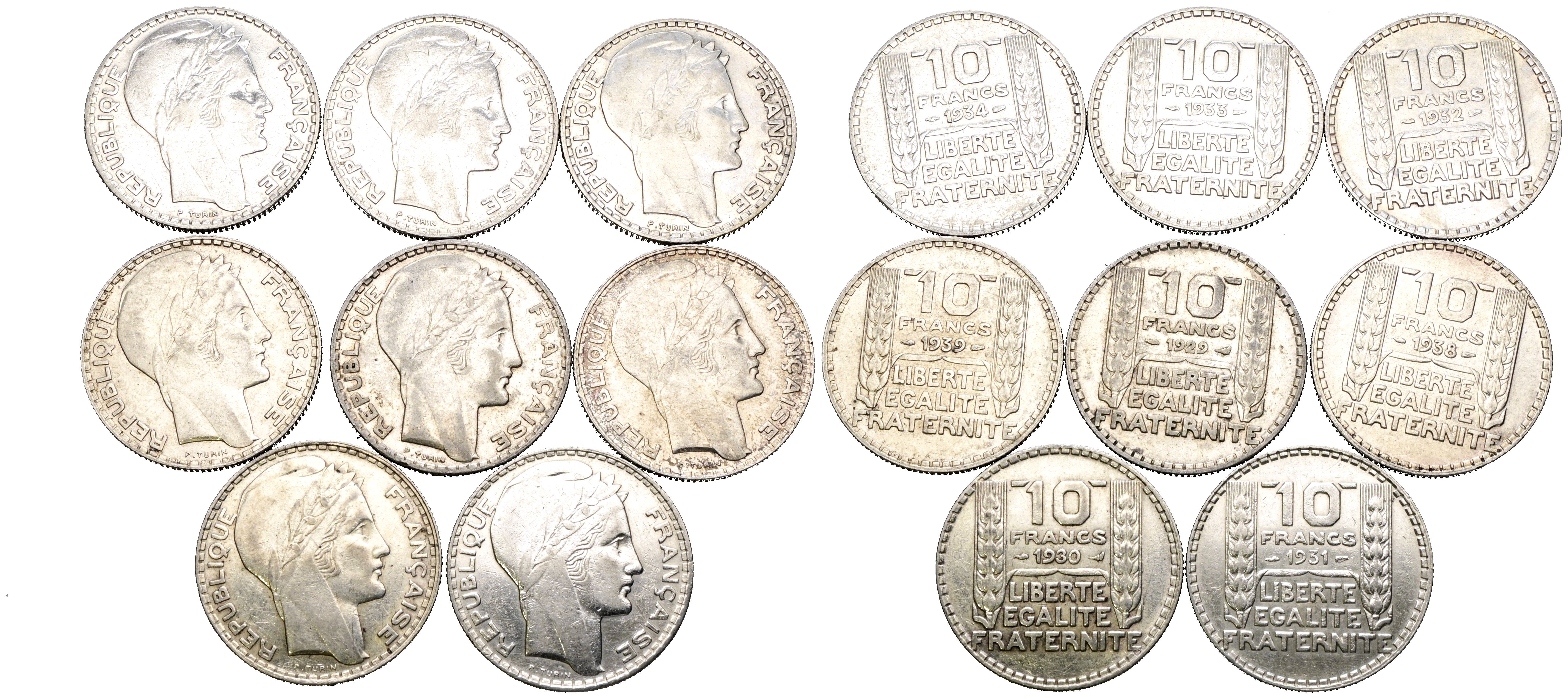 FRANCE. Set of eight silver 10-franc coins minted between 1929 and 1939. No repeated dates. Varying states of preservation. FOR EXAMINATION.