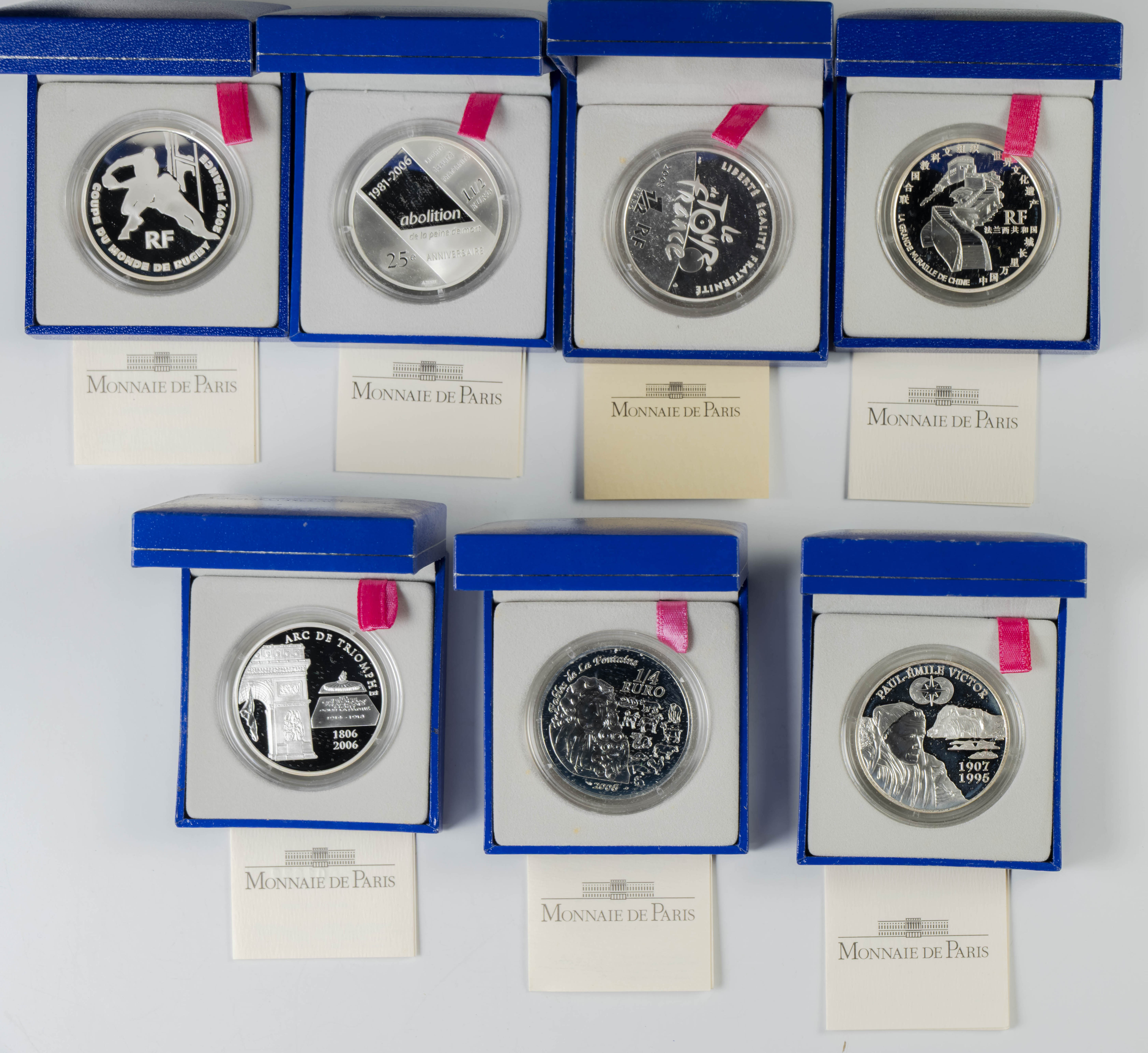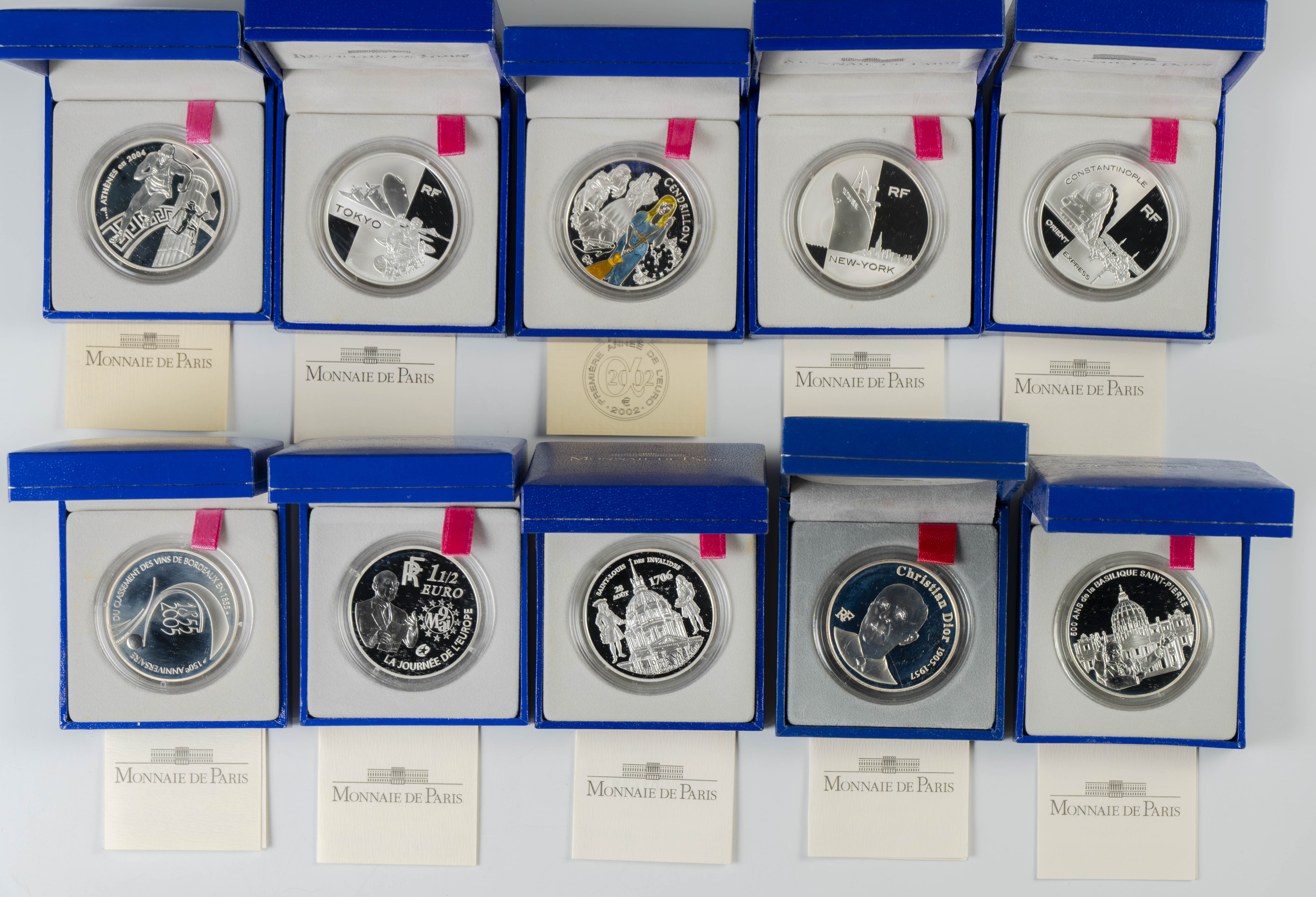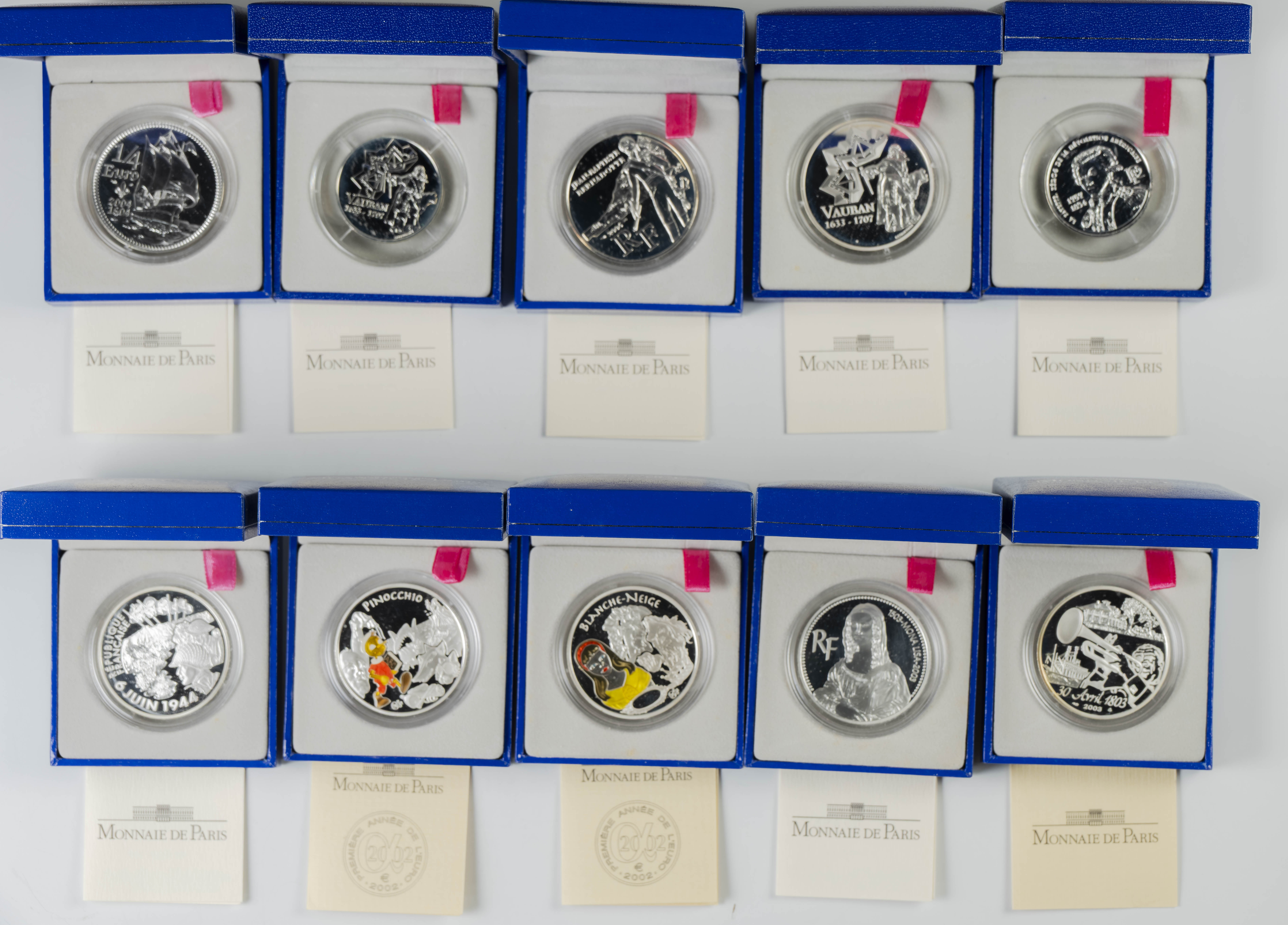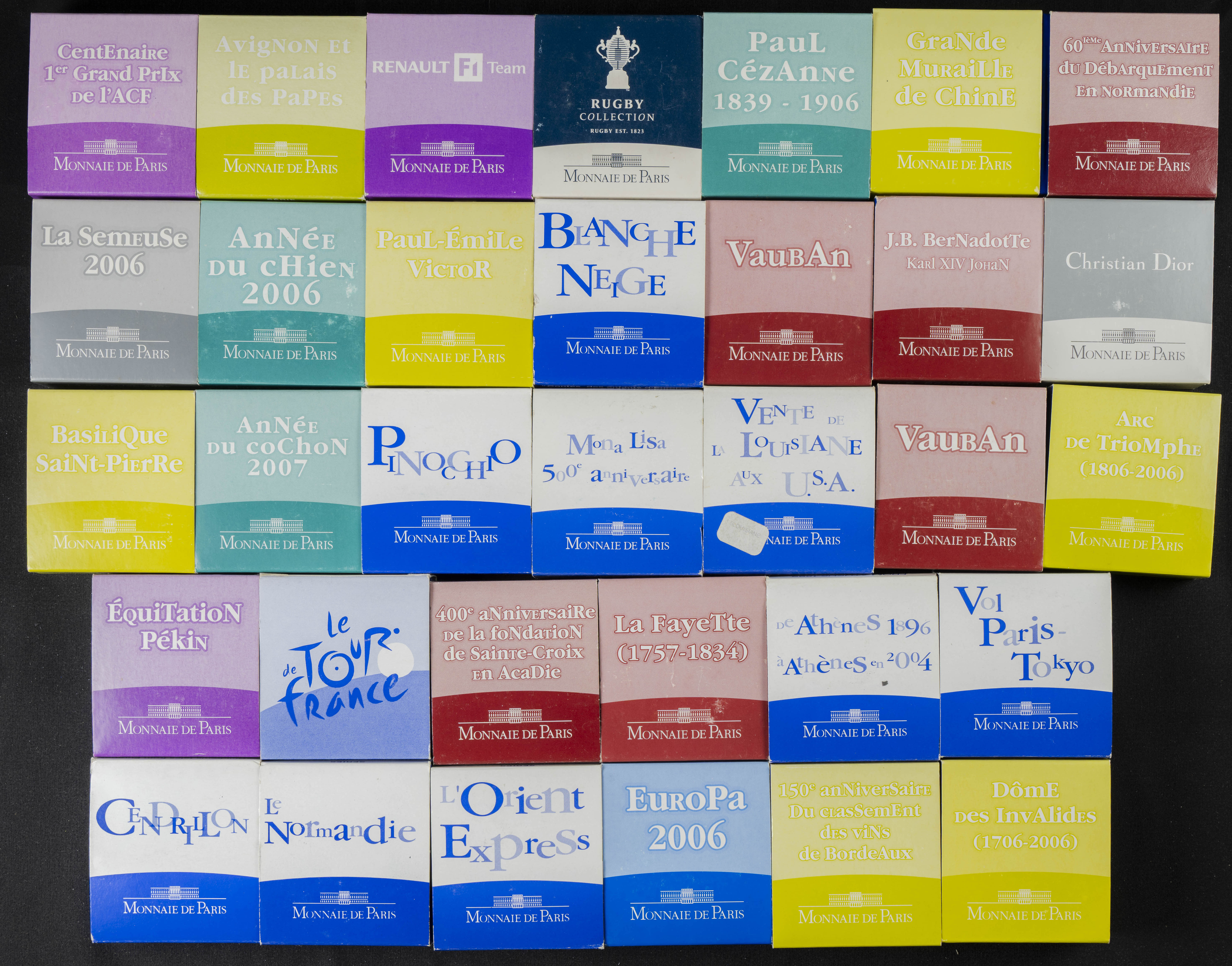 English FRANCE. Magnificent and varied set of 34 cases with 1/4 (6) and 1/2 Euro (28) silver denominations. Different themes and dates, and no duplicate cases. PROOF and UNC grades. The cases are in excellent condition, including the majority of certificates of authenticity. FOR EXAMINATION.