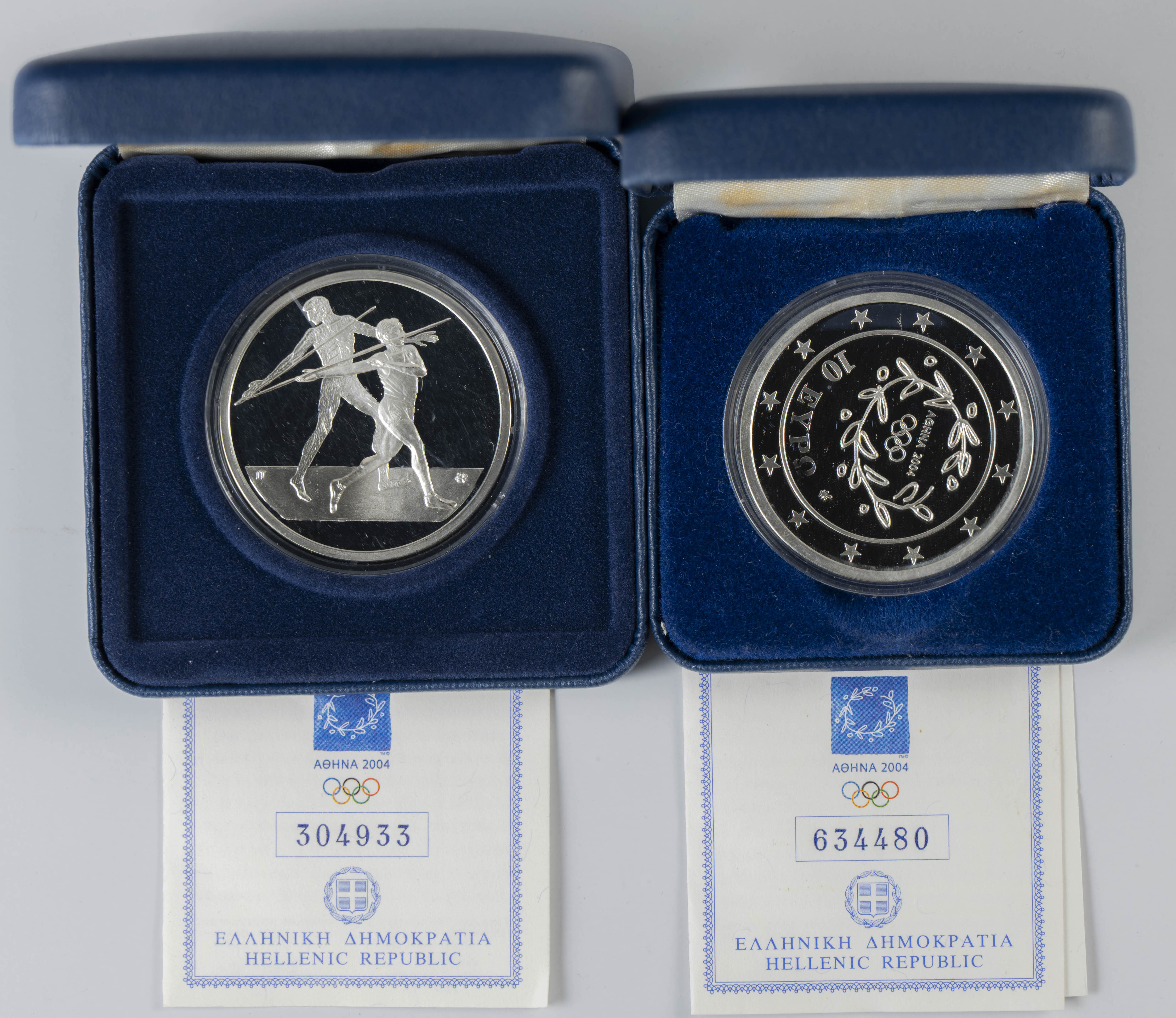 GREECE. Pair of €10 silver commemorative coins from the 2004 Athens Olympics. Includes original cases and certificates of authenticity. PROOF.