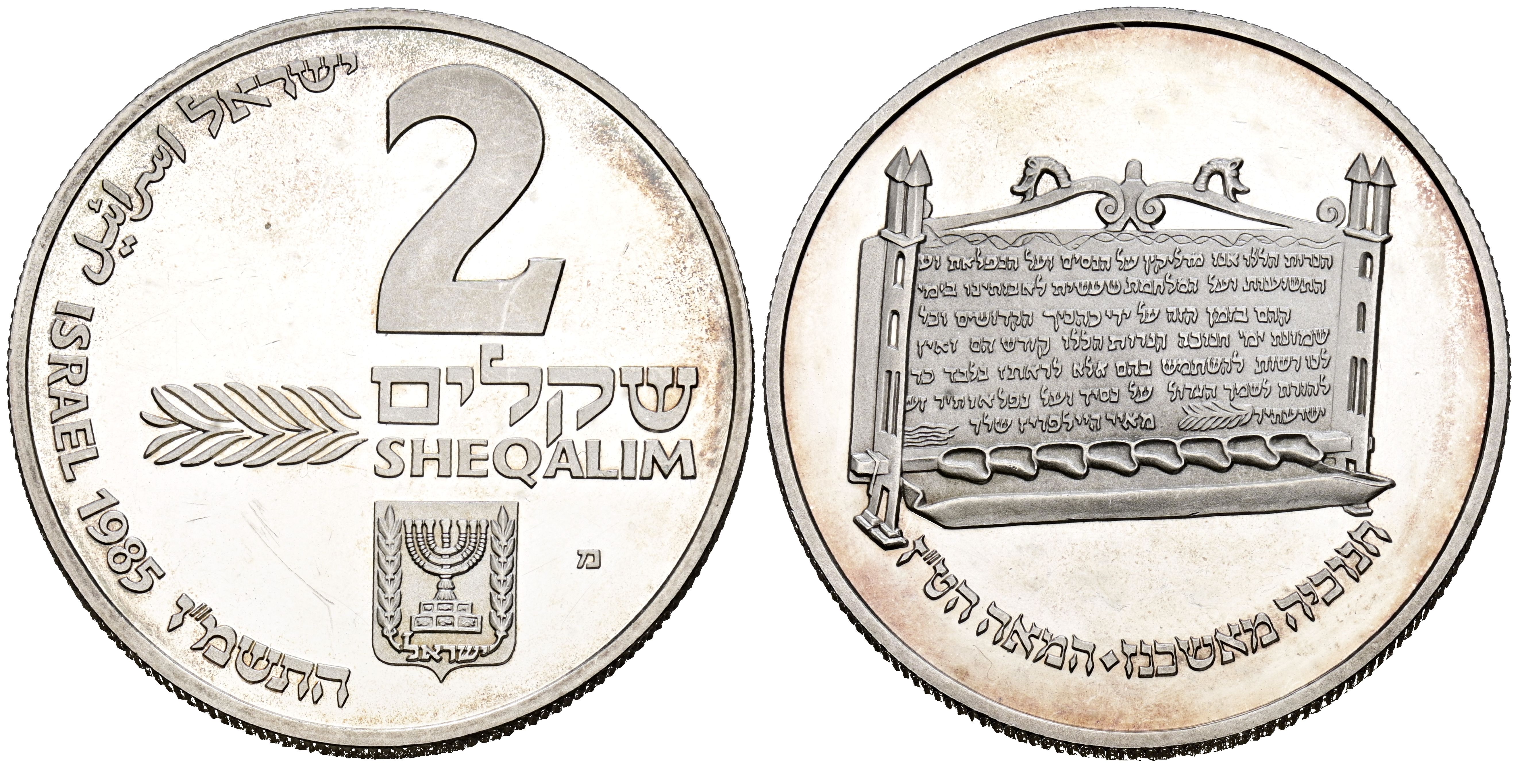 ISRAEL. 2 Sheqalim. (Ar. 28.90g/37mm). 1985. Hanukkah. Ashkenaz lamp. (Km#162). PROOF. Stripes.
