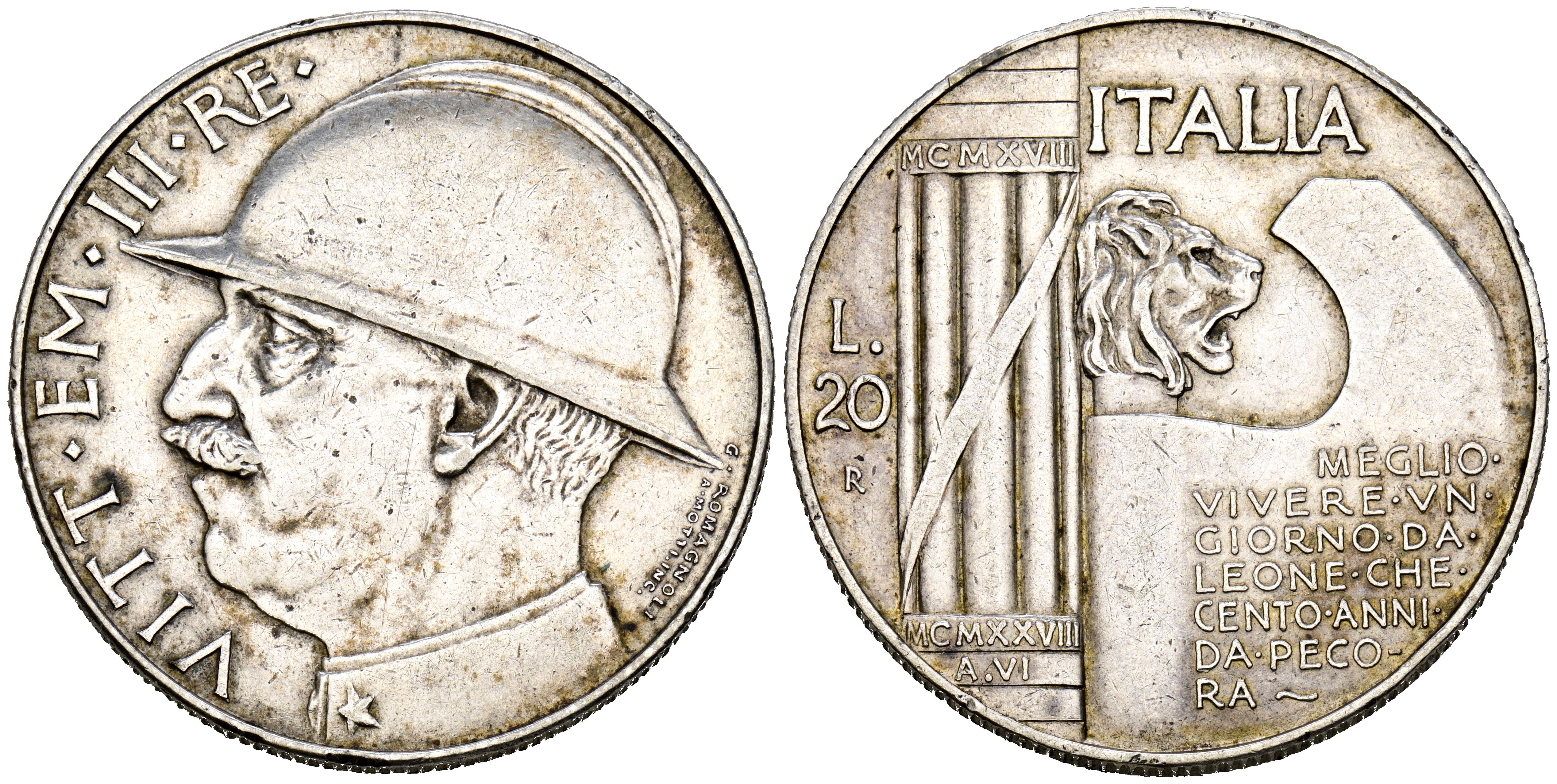ITALY, Victor Emmanuel III. 20 Liras (Ar. 19.90g/36mm). 1928. Rome R. 10th Anniversary of the end of World War I. (Km#70). Good Very Fine. Strange.