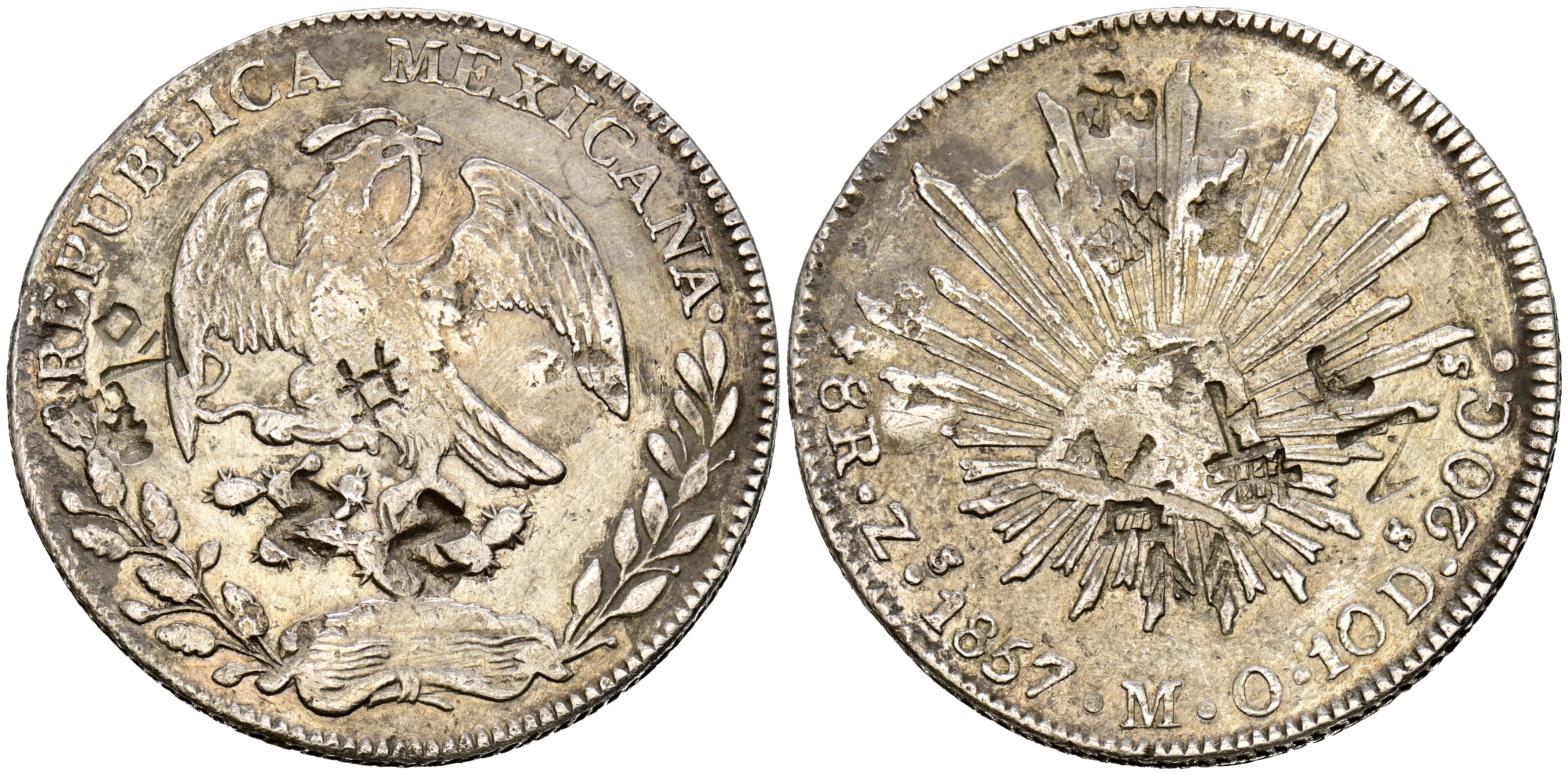 MEXICO. 8 Reales. (Ar. 26.57g/39mm). 1857. Zacatecas, MO. (Km# 377.13). VF+. Eastern counterstamps.