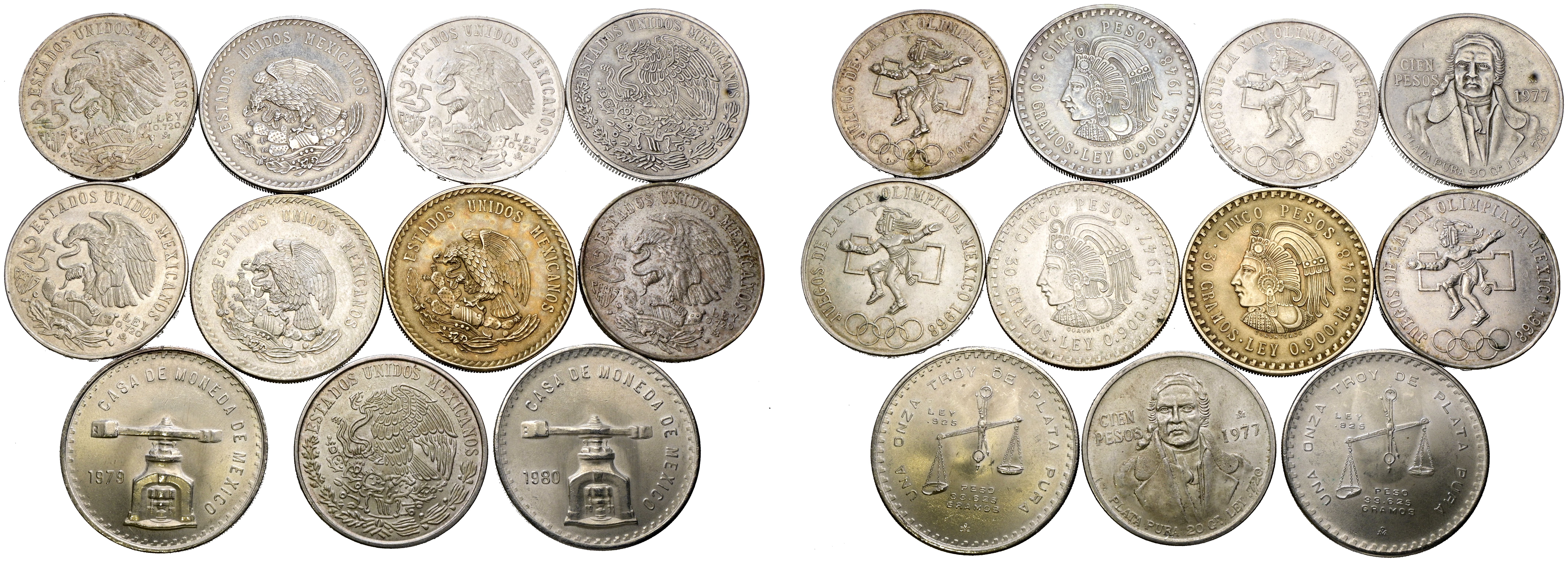 MEXICO. Set of 11 silver coins minted between 1947 and 1980 in various denominations (troy ounce, 5, 25, and 100 pesos). Various states of preservation. FOR EXAMINATION.