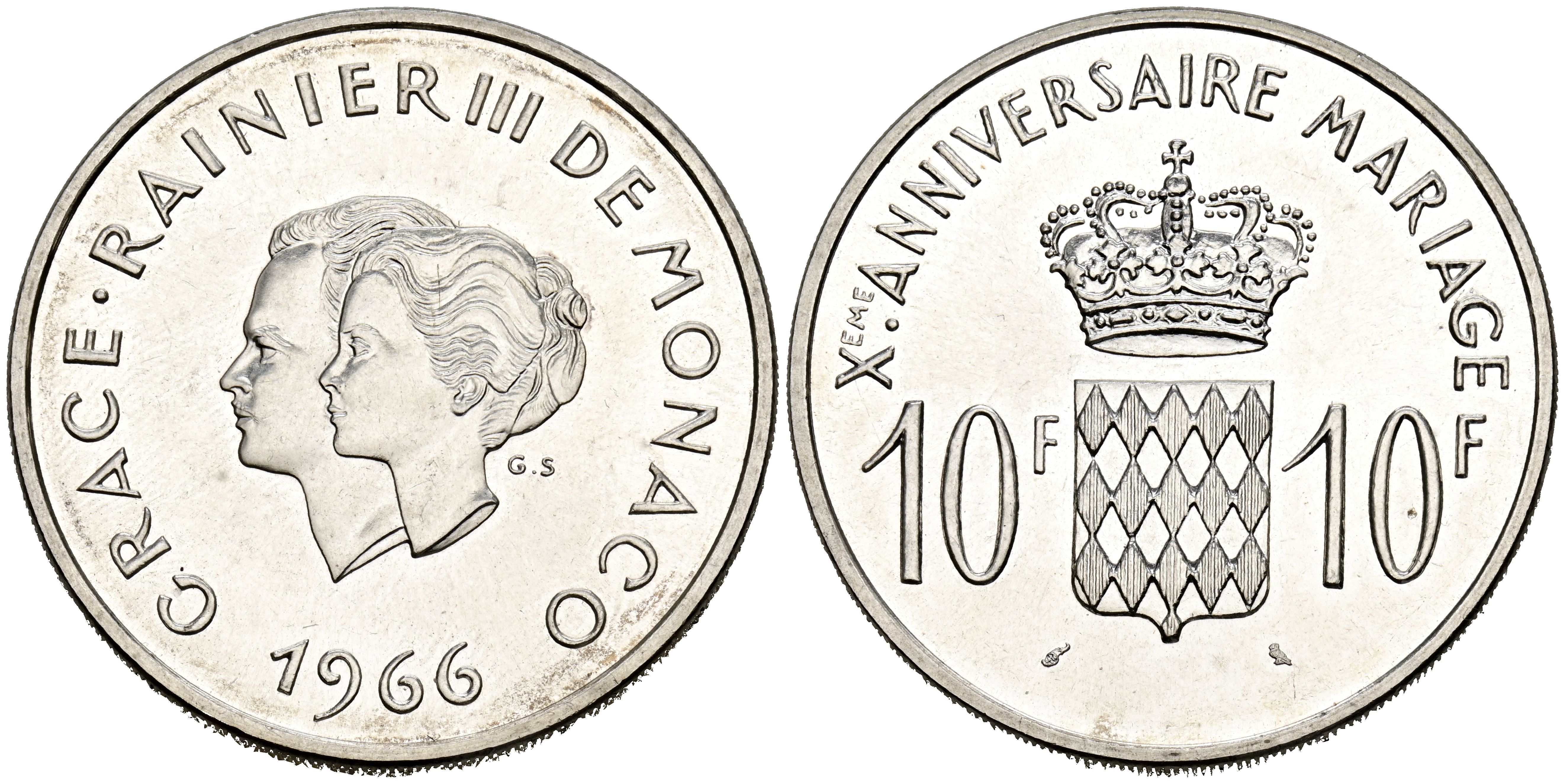 English MONACO. 10 Francs. (Ar. 24.87g/37mm). 1966. 10th Wedding Anniversary of Rainier and Grace. (Km.UWC#M1). VF. Scarce.