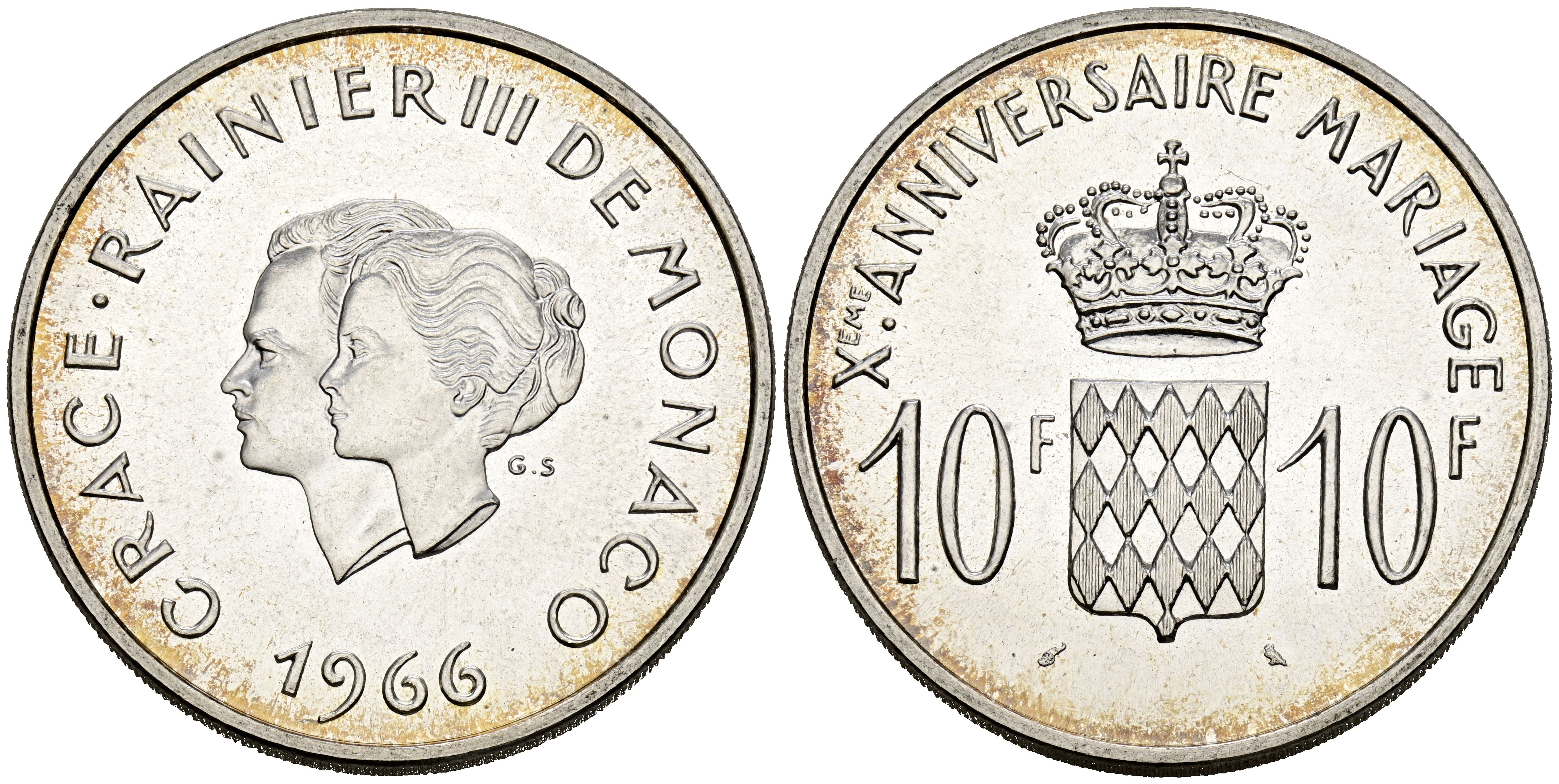 MONACO. 10 Francs. (Ar. 25.04g/37mm). 1966. 10th Wedding Anniversary of Rainier and Grace. (Km.UWC#M1). VF+. Scarce.