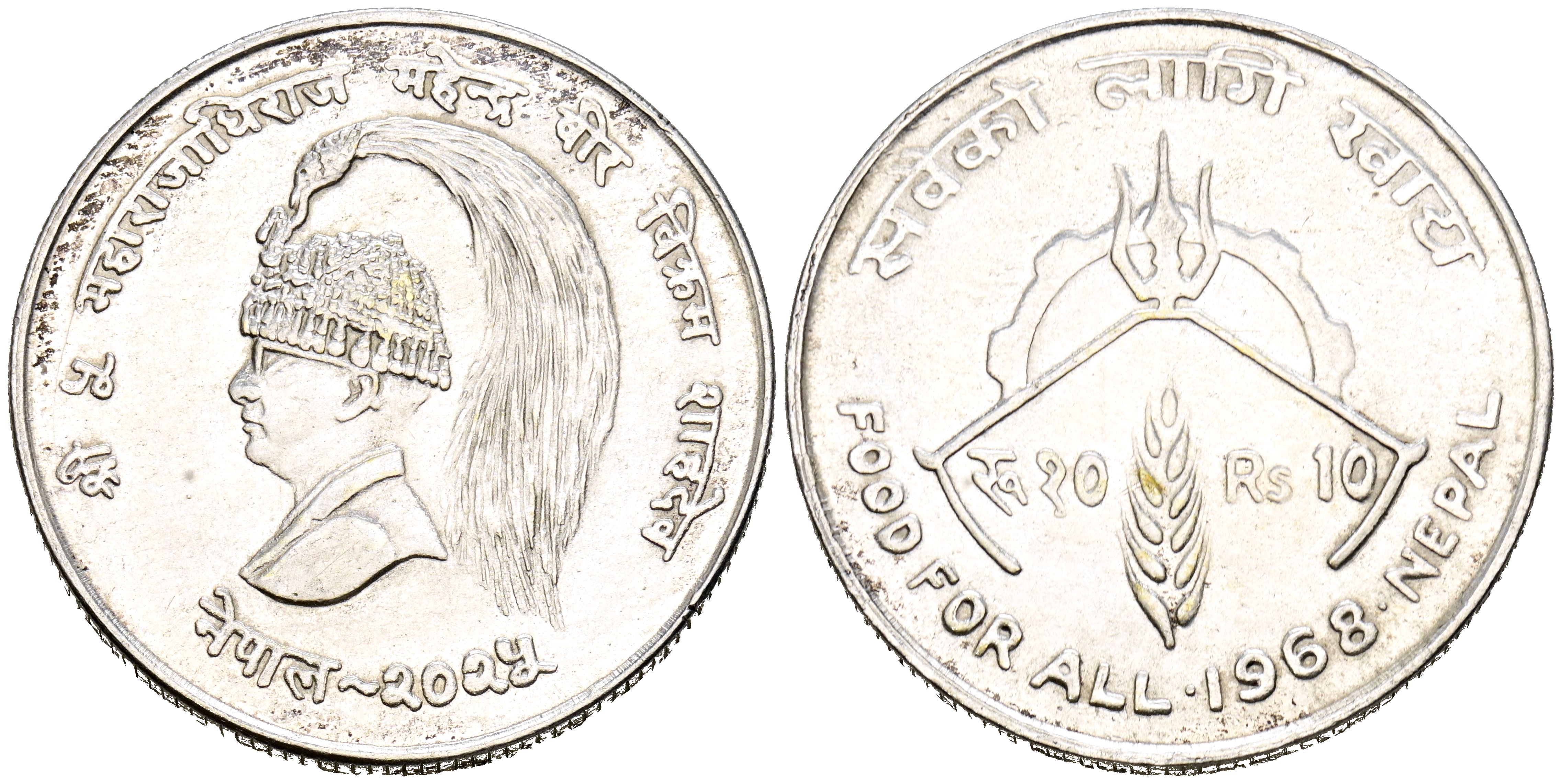 NEPAL. 10 Rupees. (Ar. 15.57g/32mm). 1968. Kathmandu. FAO. (Km#794). Extremely Fine-.