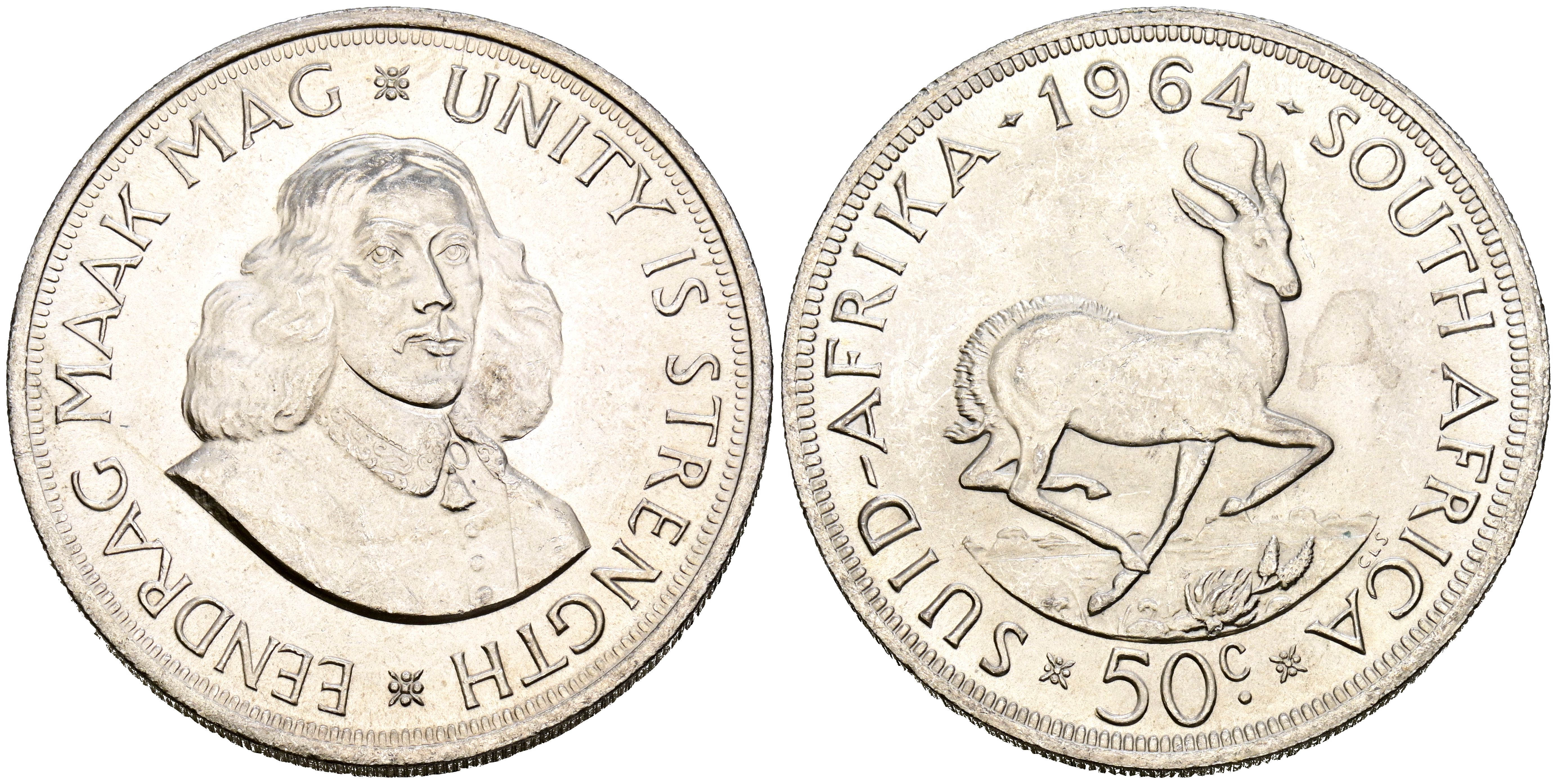 English SOUTH AFRICA. 50 Cents. (Ar. 28.15g/39mm). 1964. Jan Van Riebeeck. (Km#62). Good Extremely Fine.