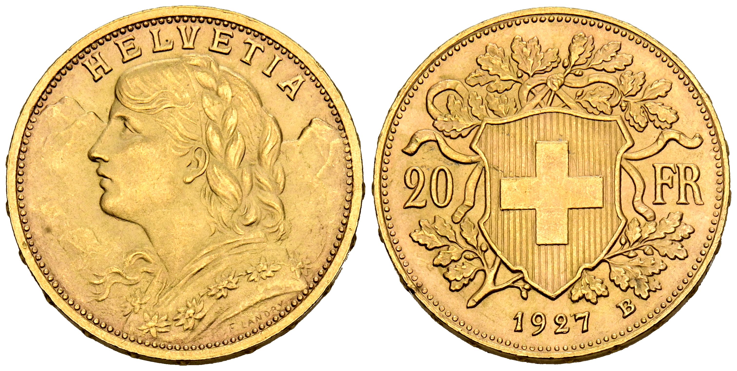 SWITZERLAND. 20 Francs (Au. 6.45g/21mm). 1927. Berne B. (Km#35.1). Uncirculated-. Beautiful specimen.