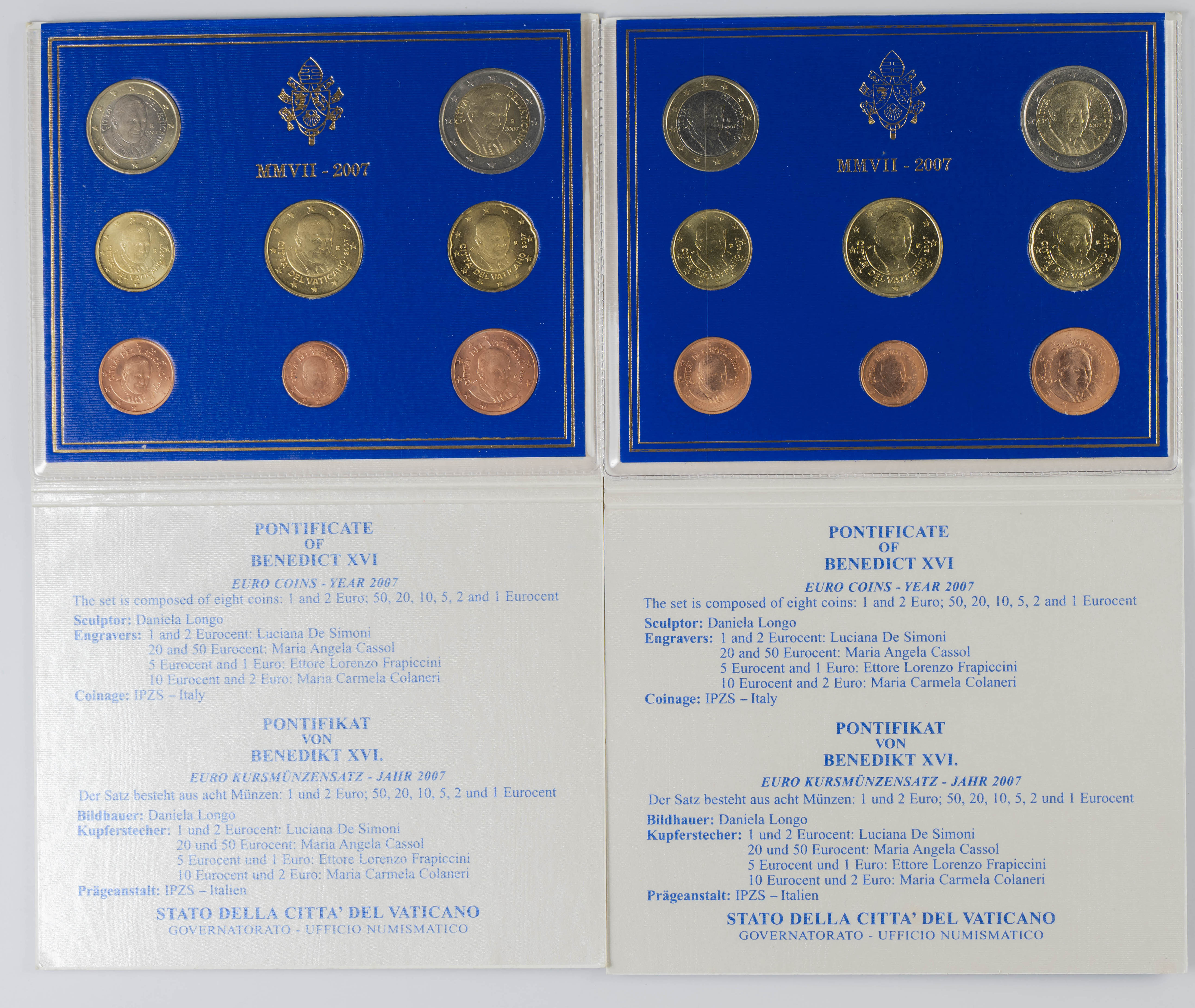 VATICAN, Benedict XVI. Pair of complete official sets from 2007 with eight denominations ranging from 1 cent to 2 euros. Uncirculated.