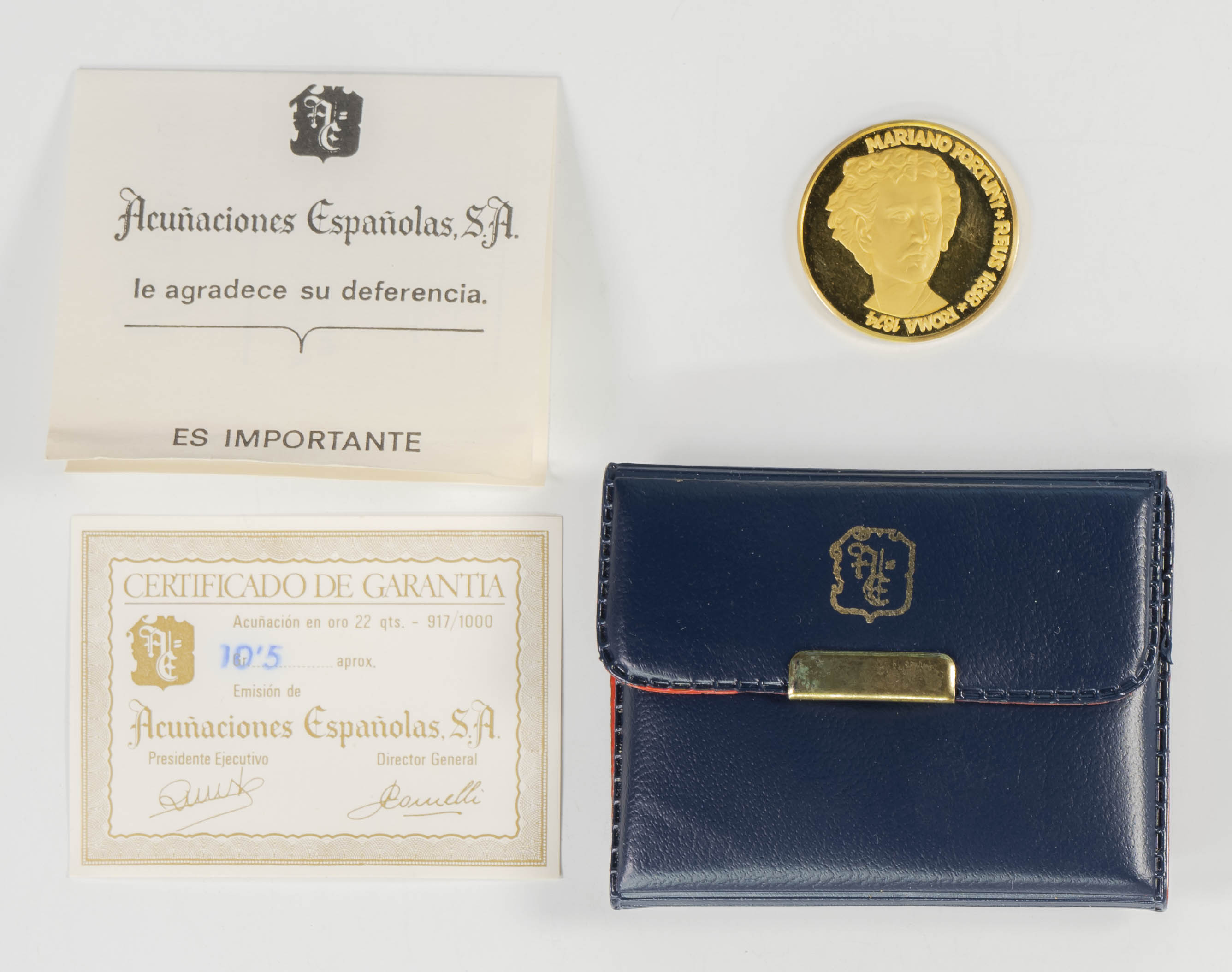 SPAIN. Mariano Fortuny 1838-1874. (Au. 10.46g/28mm). Spanish Coinage SA 0.917 Gold. PROOF. Includes official coin case and certificate of authenticity.