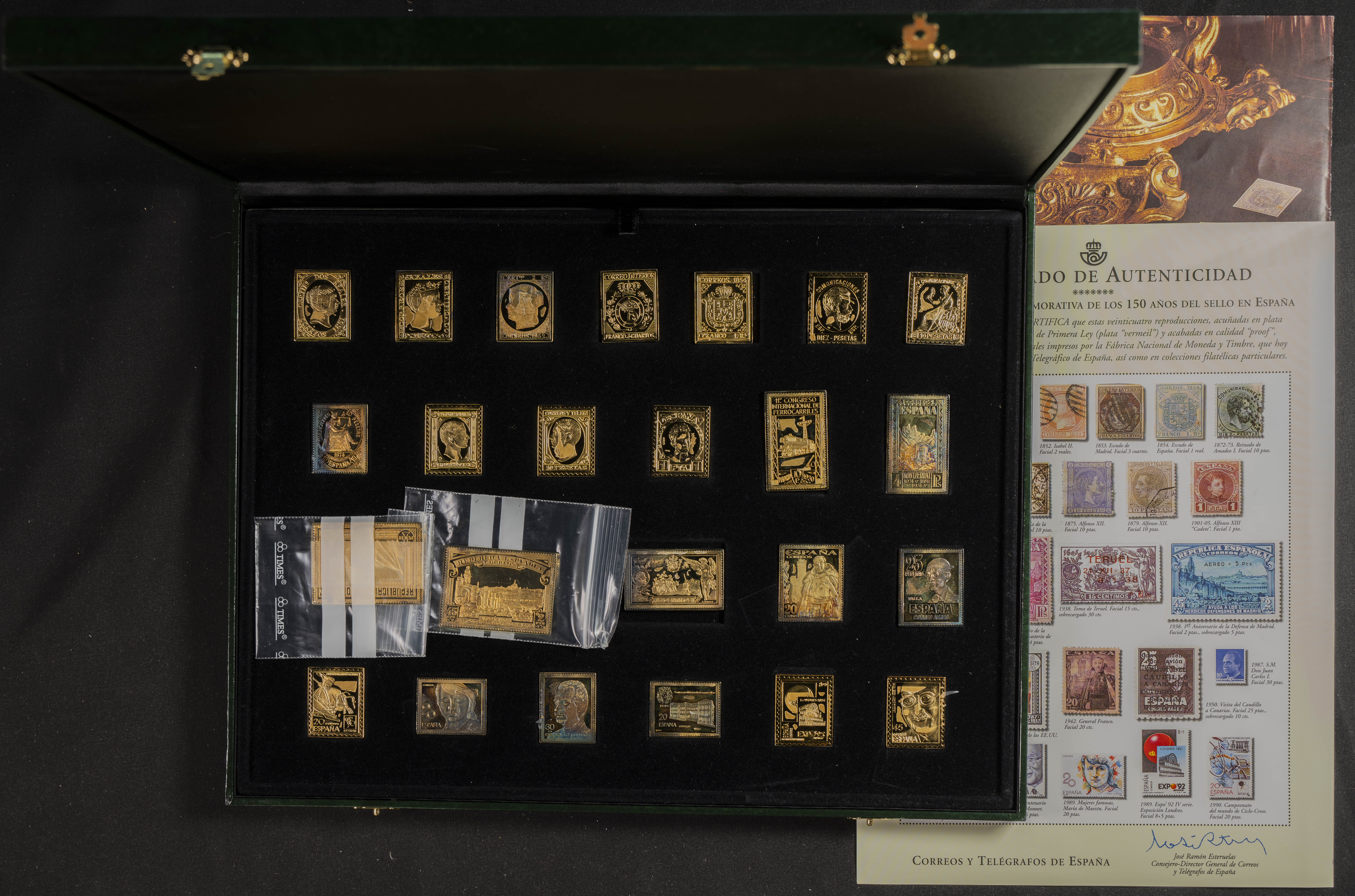 SPAIN. Philatelic Treasures of the World. Collection of 24 stamp replicas in solid silver and gold-plated. Includes original box, booklet, and certificate of authenticity.