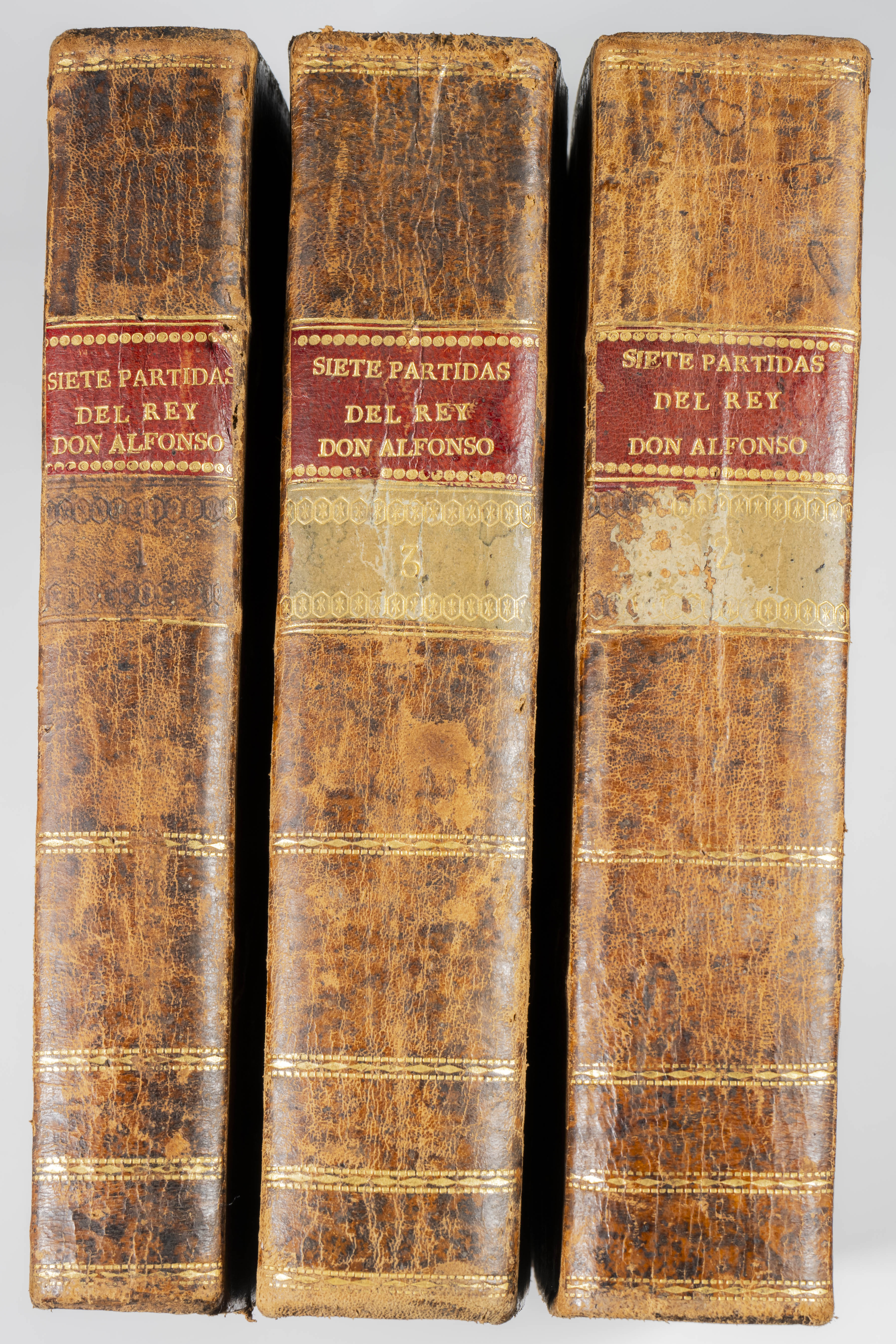 THE SEVEN PARTIDAS OF KING ALFONSO THE WISE. Royal Academy of History. Royal Printing Office, Madrid 1807. Three volumes: 1 (524 pages), 2 (834 pages), and 3 (795 pages). Hardcover binding, containing a beautiful engraving of King Alfonso X the Wise, as well as some foldouts. In very good condition. Written during the reign of Alfonso X, it took its current name around the 14th century, as it had previously been called the "Book of Laws." This work is considered one of Castile's most important legacies to the history of law, as it is the most extensive and long-standing body of law in Spain and Latin America (until the 19th century AD). It has even been described as a "humanist encyclopedia," as it covers philosophical, moral, and theological topics (of Greco-Latin origin), although the text itself confirms the legislative nature of the work, stating in the prologue that it was dictated in view of the confusion and abundance of regulations and that it was solely to be judged by them.