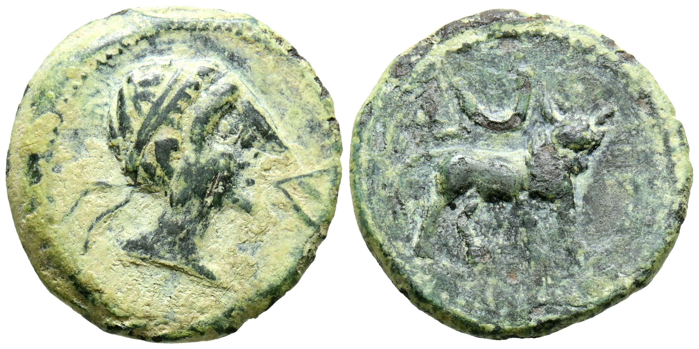 CASTULO (Cazlona, Jaén). Semi-annual (4.73g/20mm). 180 Fine (FAB-722). Obverse: Diademed male head facing right, with an Iberian letter Ca in front. Rev: Bull facing right, with the letter L and crescent above it, and the Iberian legend CaSTeLe in exergue. VF.