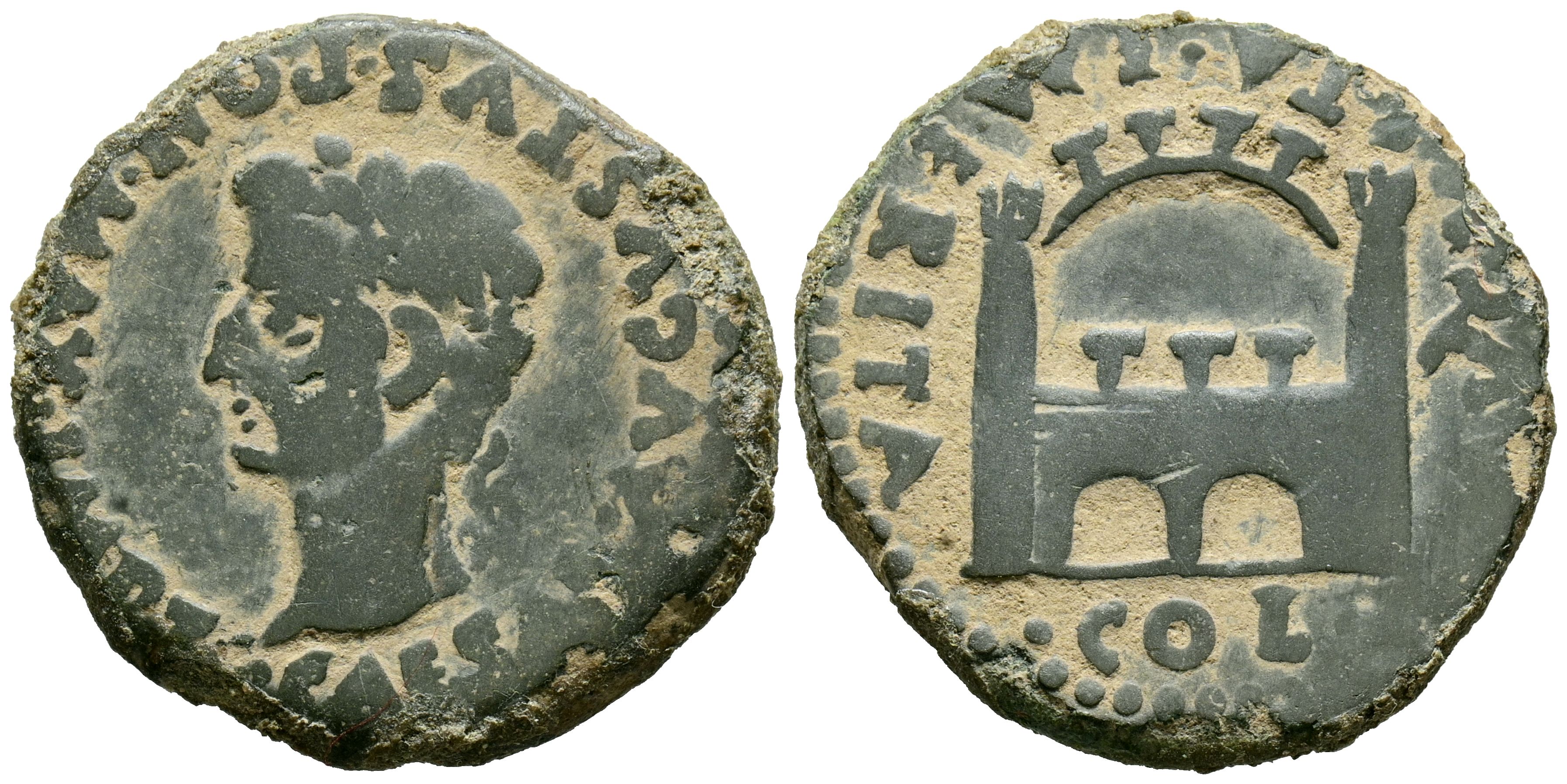 EMERITA AUGUSTA (Mérida). As. (Ae. 7.09g/26mm). 14-36 AD (FAB-1056) Obv: Laureate head of Tiberius facing left, surrounding legend: TI CAESAR AVG PON MAX IMP. Rev: City gate, surrounding legend: COL AVGVSTA EMERITA. VF-.