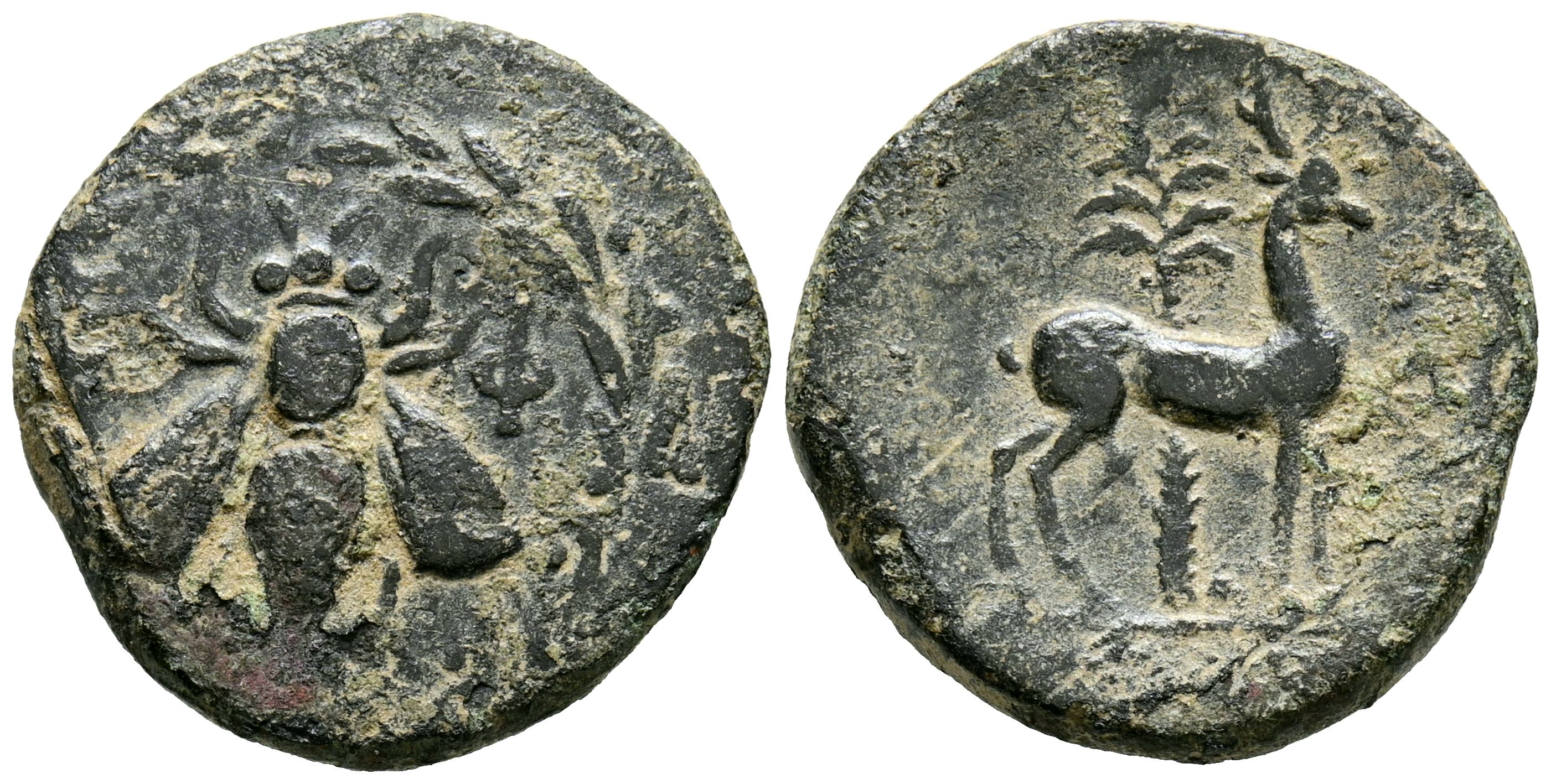 IONIA, Ephesus. Calque. (Ae. 4.24g/19mm). 202-133 Fine (SNG Copenhagen 299). Obv: Bee within a laurel wreath. Rev. Deer standing right, palm tree behind, between Greek letters. VF.