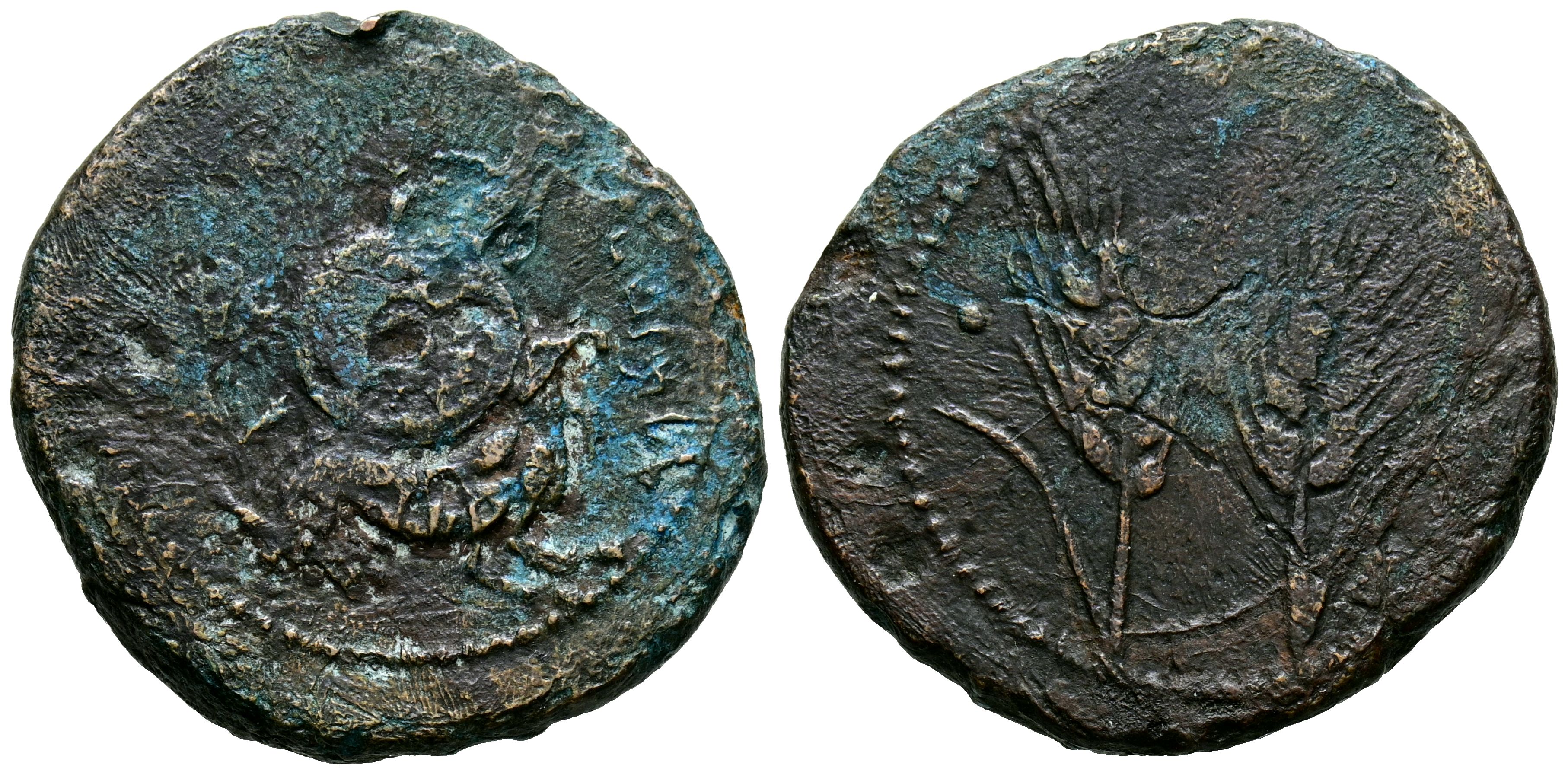 English ITUCI (Tejada la Vieja, Seville). As. (Ae. 12.08g/27mm). 150-50 Fine (FAB-1601). Obv: Horseman with shield facing left, Punic legend below. Rev: Two ears of wheat. VF-/VF. Oxidation.
