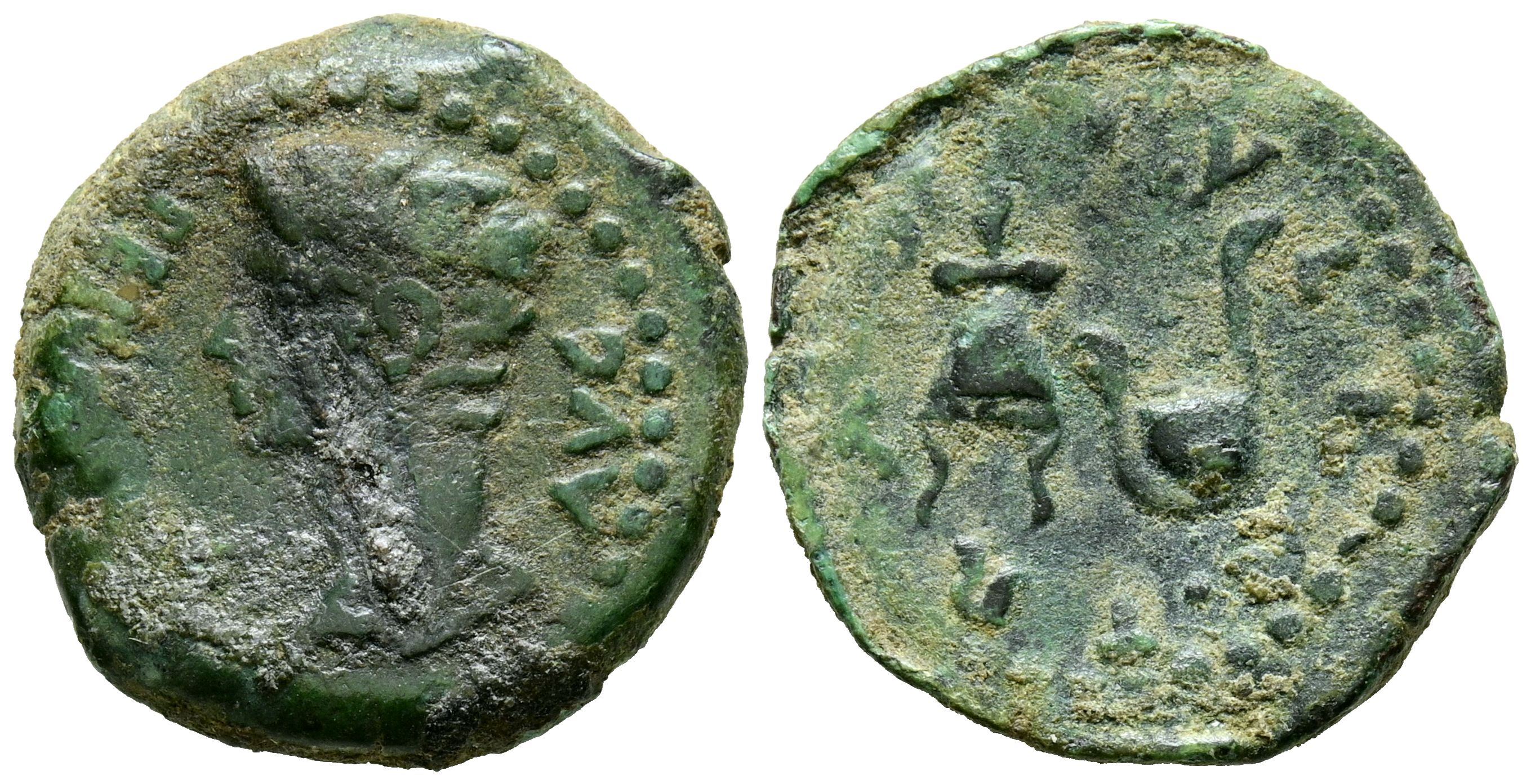 IULIA TRADUCTA (Algreciras, Cádiz). Semis. (Ae. 4.09g/19mm). 27 Fine-14 AD (FAB-1621). Obv: Head of Augustus facing left, surrounding legend: PERM CAES AVG. Rev: Flamenate cap and symbol, surrounding legend: IVLIA TRAD. VF.