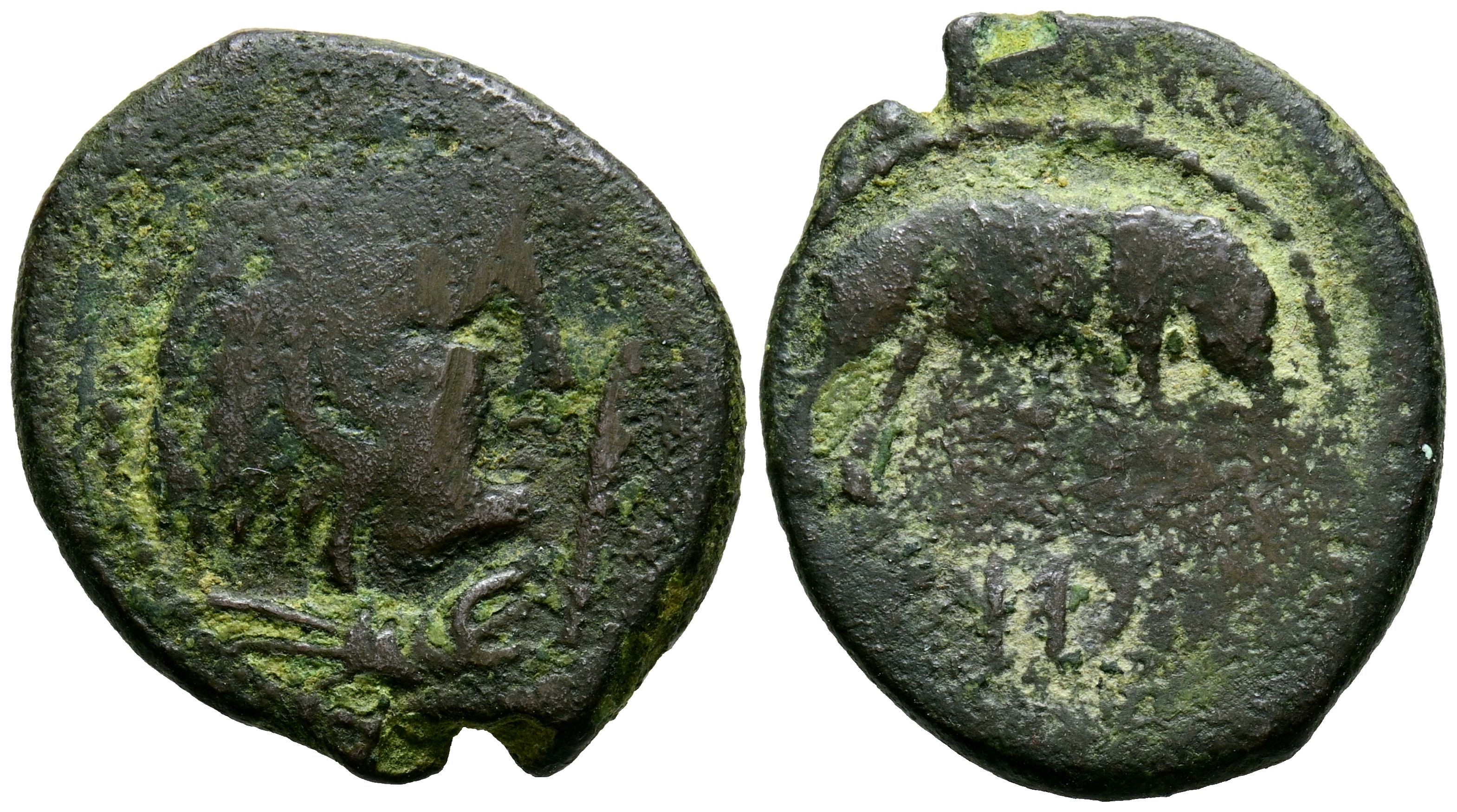 English LAUncirculatedUTA (Alcalá de los Gazules, Cádiz). Semi-colonial (Ae. 5.15g/20mm). 150-50 Fine (FAB-1672). Obverse: Head of Melqart with a lion's skin facing right, nailed to the front. Reverse: Elephant facing right, below the Libyan-Phoenician legend. VF-. Rare.