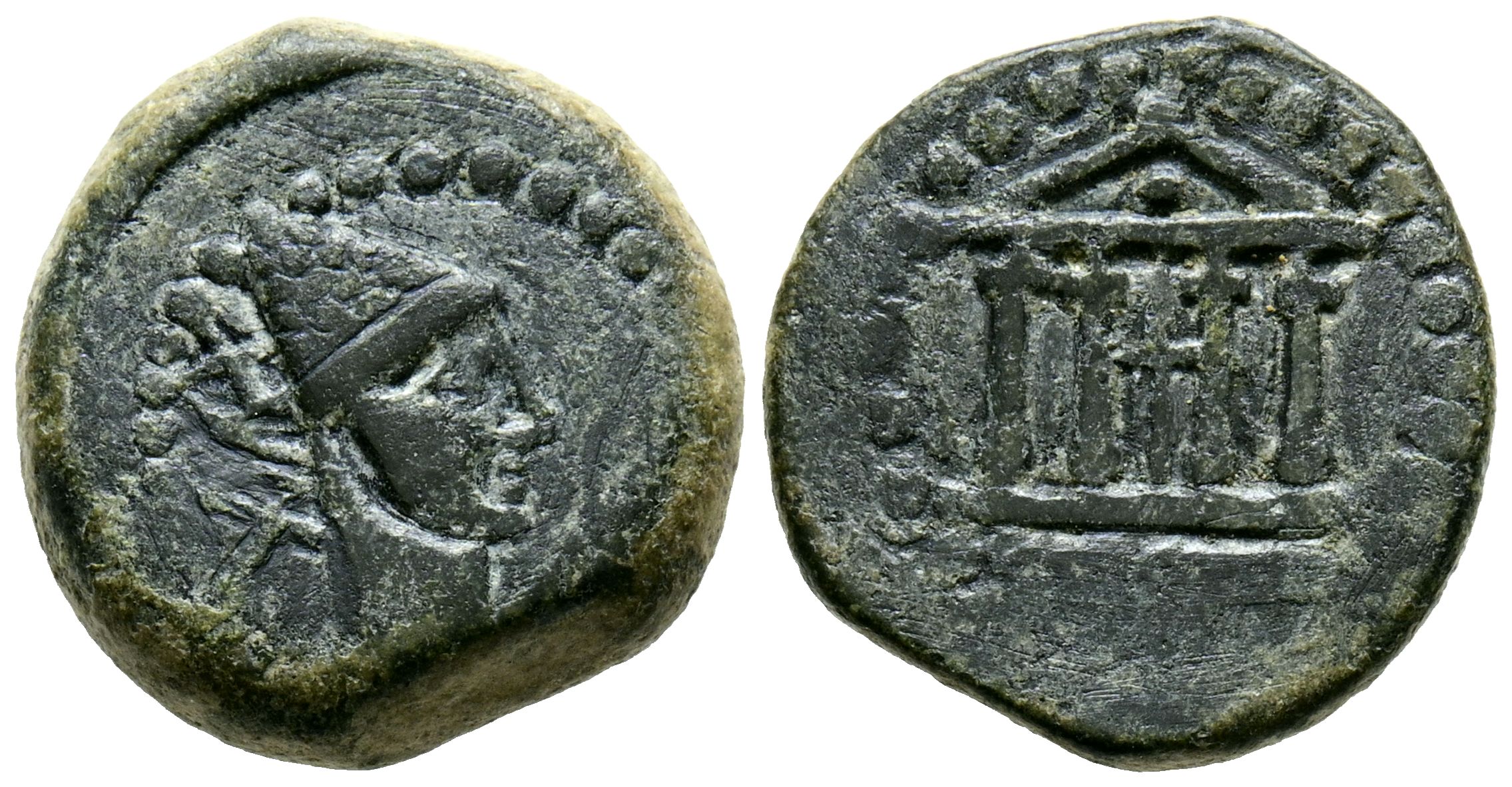 MALACA (Málaga). Quadrant. (Ae. 4.07g/16mm). 200-20 Fine (FAB-1739). Obv: Head of Vulcan facing right, pincers in front, Punic legend type B behind. Rev: Tetrastyle temple, Punic legend type C below. VF.