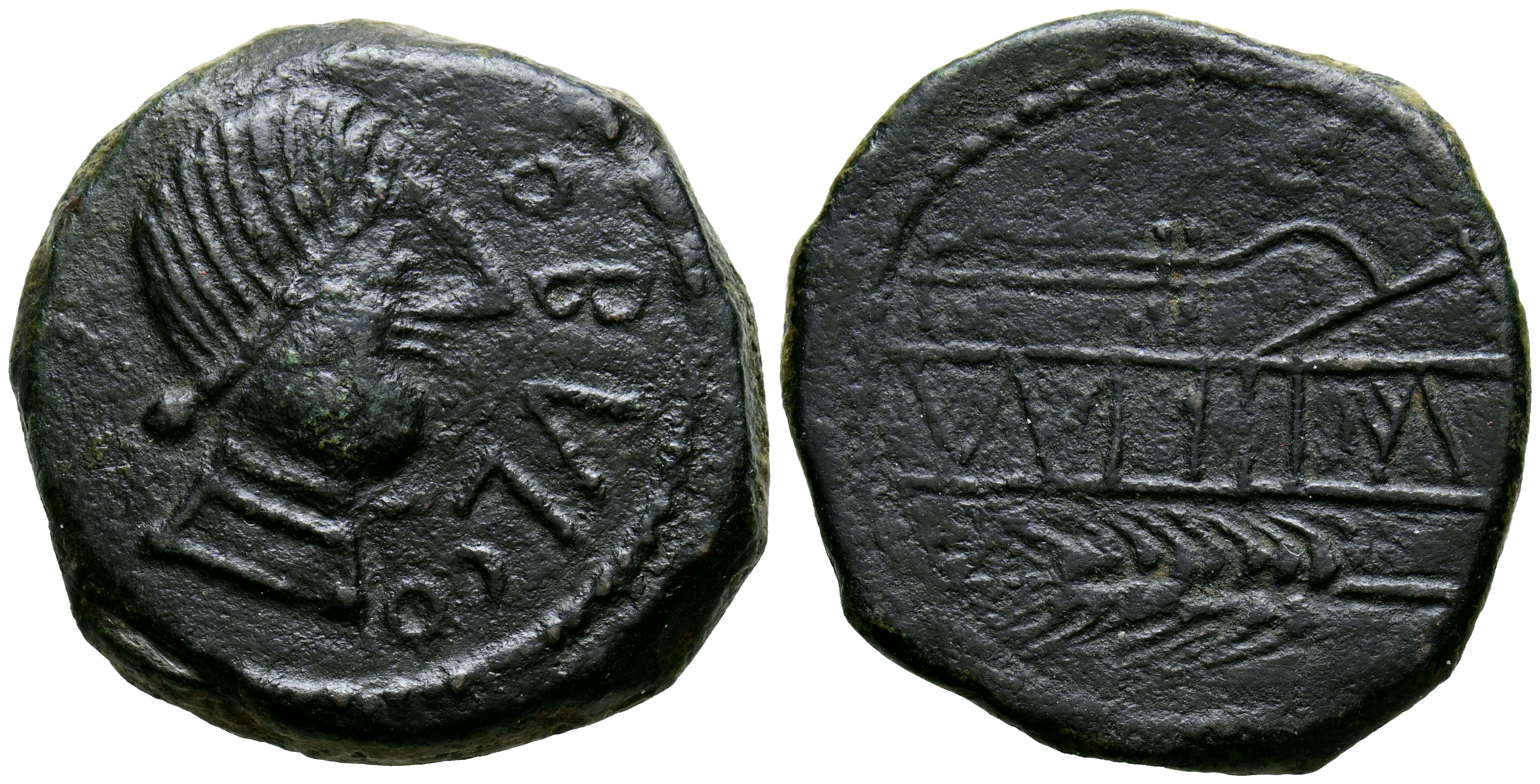 OBULCO (Porcuna, Jaén). As. (Ae. 18.60g/30mm). 220-20 Fine (FAB-1804). Obv: Female head facing right, legend in front: OBVLCO. Rev: Iberian legend: IBuLCa, between a plough on the right and a grain of wheat on the left. VF.