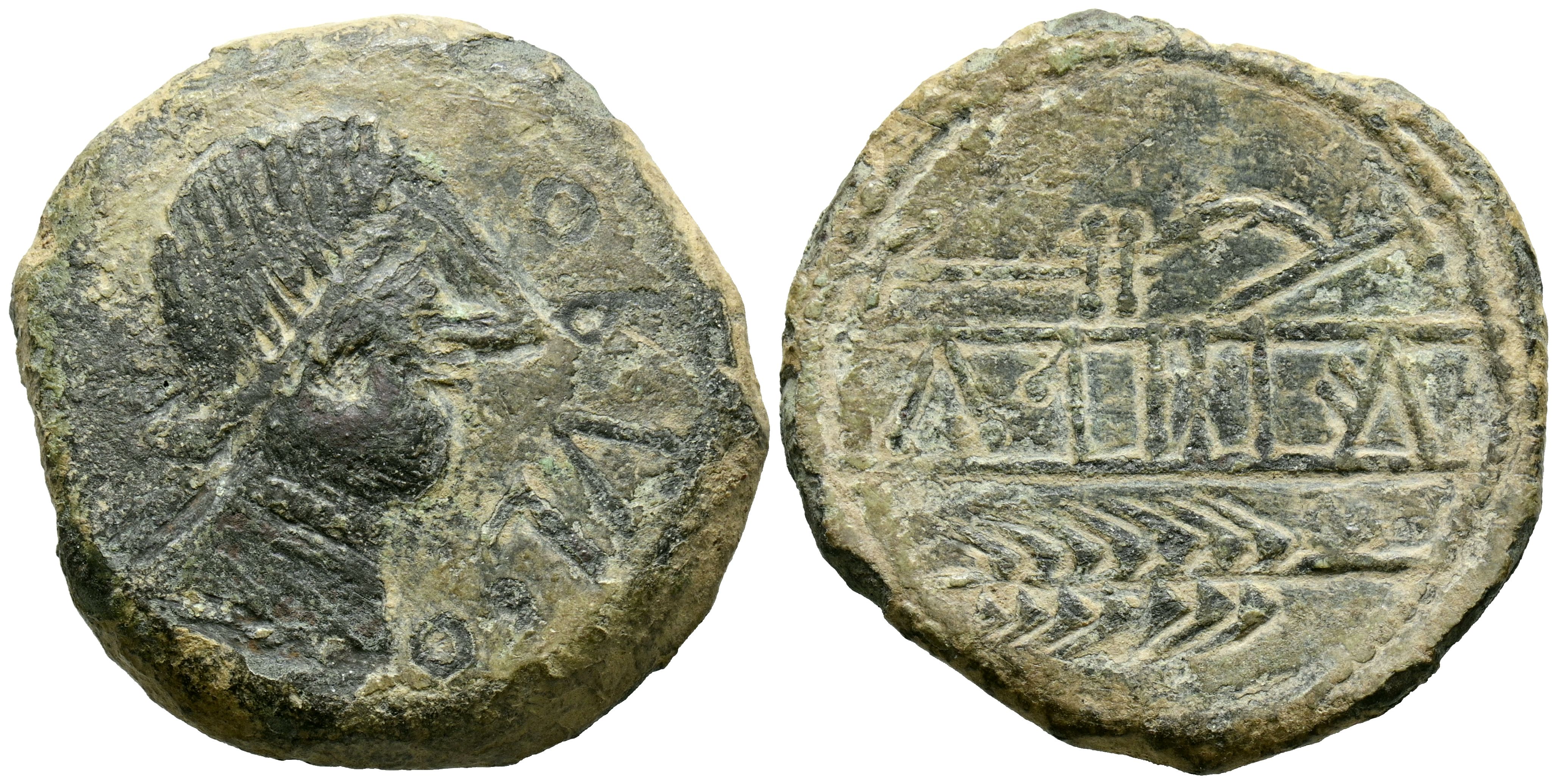 OBULCO (Porcuna, Jaén). As. (Ae. 16.05g/29mm). 220-20 Fine (FAB-1804). Obv: Female head facing right, legend in front: OBVLCO. Rev: Iberian legend: IBuLCa, between a plough on the right and a grain of wheat on the left. VF-/VF.