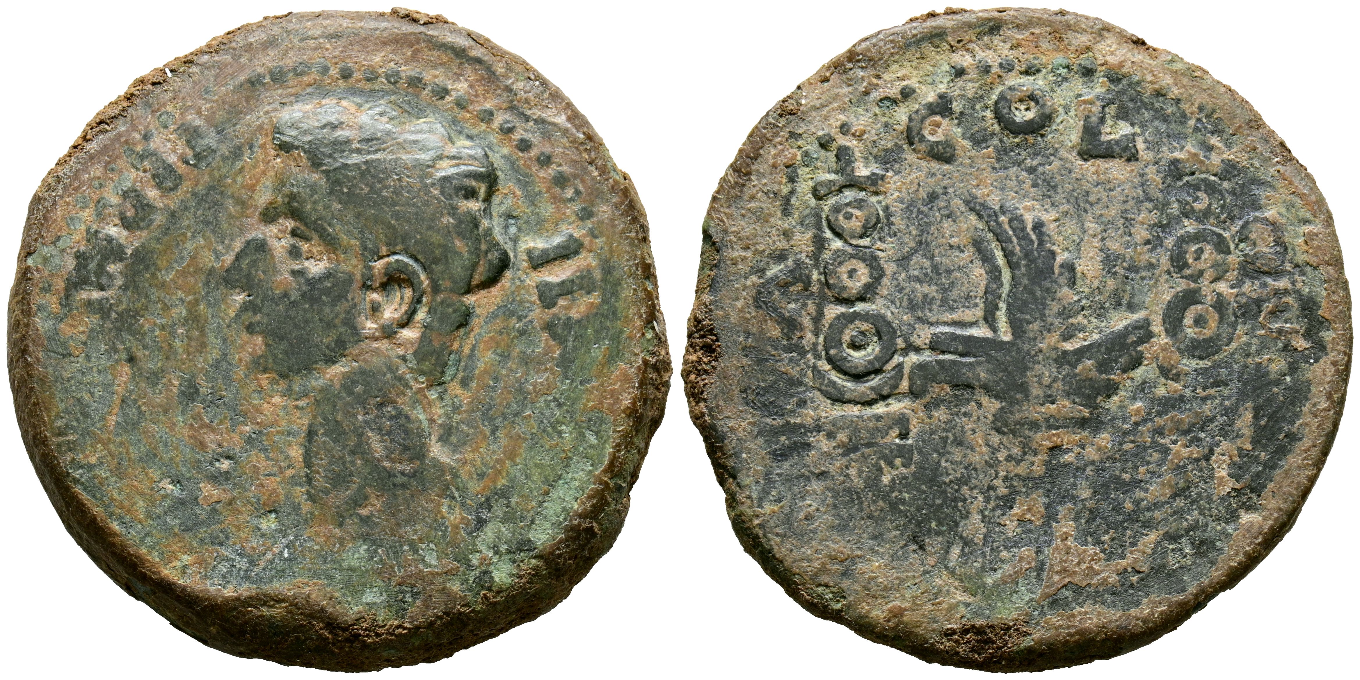 PATRICIA COLONY (Córdoba). Dupondius. (Ae. 19.95g/32mm). 27 Fine-14 AD (FAB-1988). Obv: Head of Augustus facing left, surrounding legend: PERMISSV CAESARIS AVGVSTI. Rev: Legionary ensign and eagle facing left, surrounding legend: PATRICIA COLONY. VF-. Rare specimen.