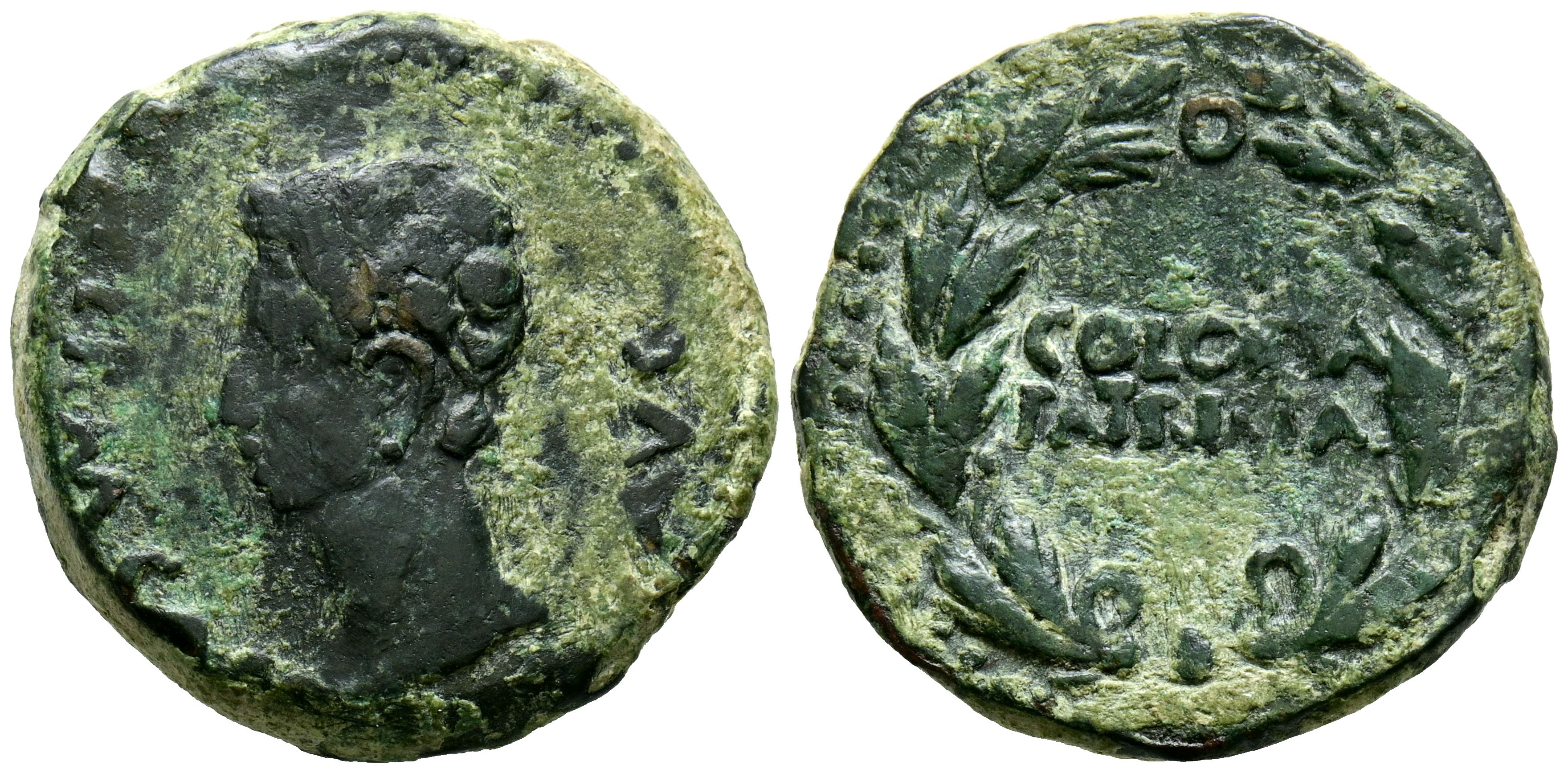 PATRICIA COLONY (Córdoba). As. (Ae. 10.53g/24mm). 27 Fine-14 AD (FAB-1989). Obv: Head of Augustus facing left, surrounding legend: PERM CAES AVG. Rev: Legend: PATRICIA COLONY, within a laurel wreath. VF-/VF.