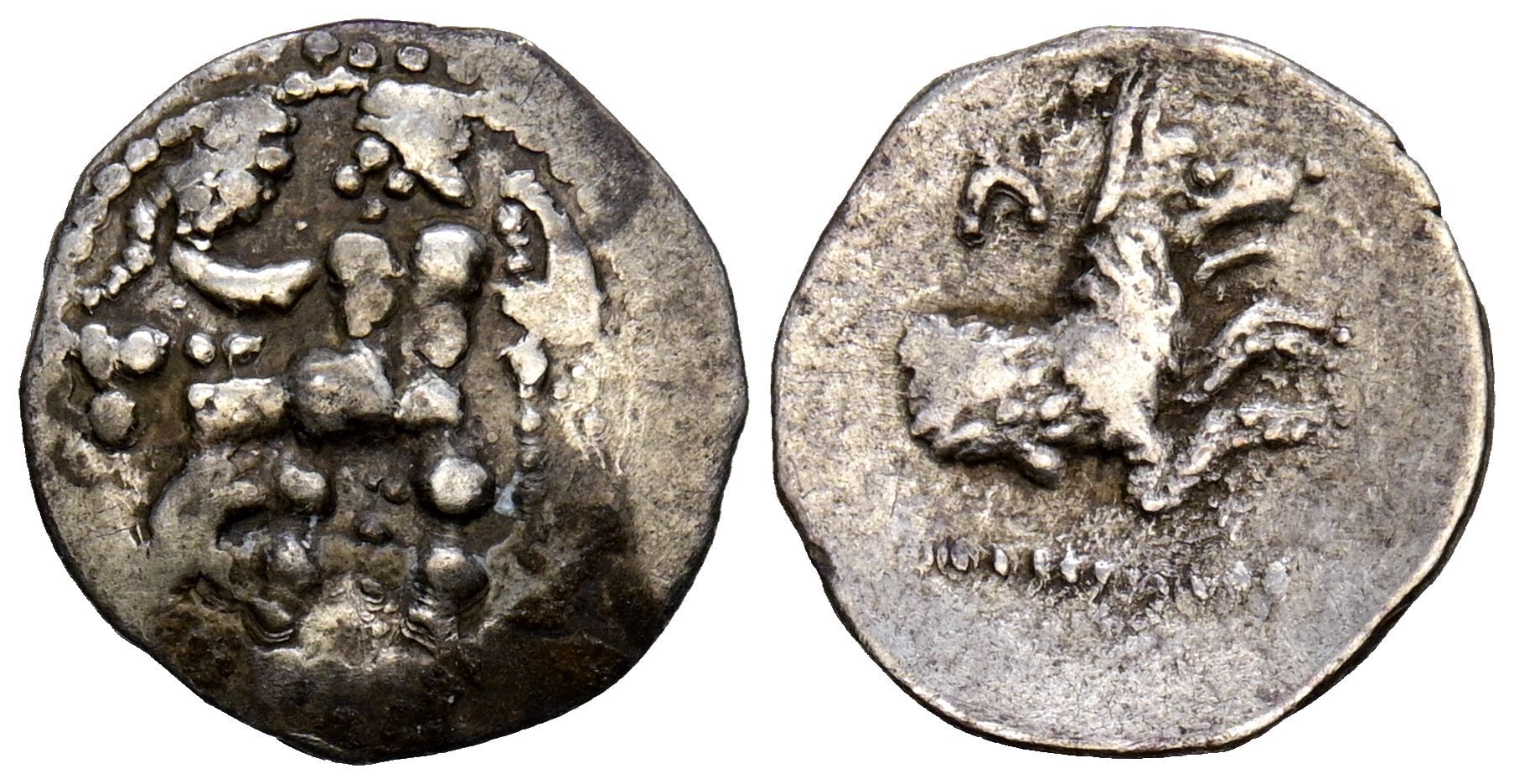 English LYKAONIA, Laranda. Obolus. (Ar. 0.64g/13mm). 324-323 Fine (SNG von Aulock 5422). Obv: Baaltars seated left, carrying a grain of wheat and a bunch of grapes and a scepter. Rev: Forepart of wolf facing right, crescent above downwards. VF.