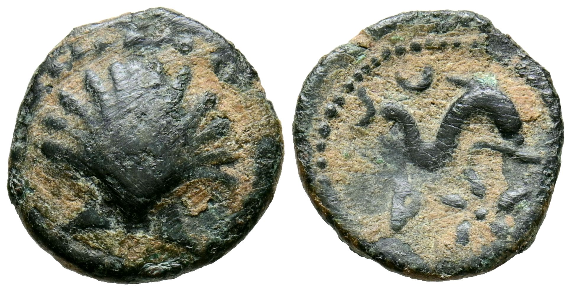 English ARSE-SAGUNTO (Sagunto, Valencia). Sextant. (Ae. 1.37g/14mm). 170-20 Fine (FAB-2064). Obverse: Dolphin, above Iberian letter: A and crescent, below Iberian letters A, I and star. VF.