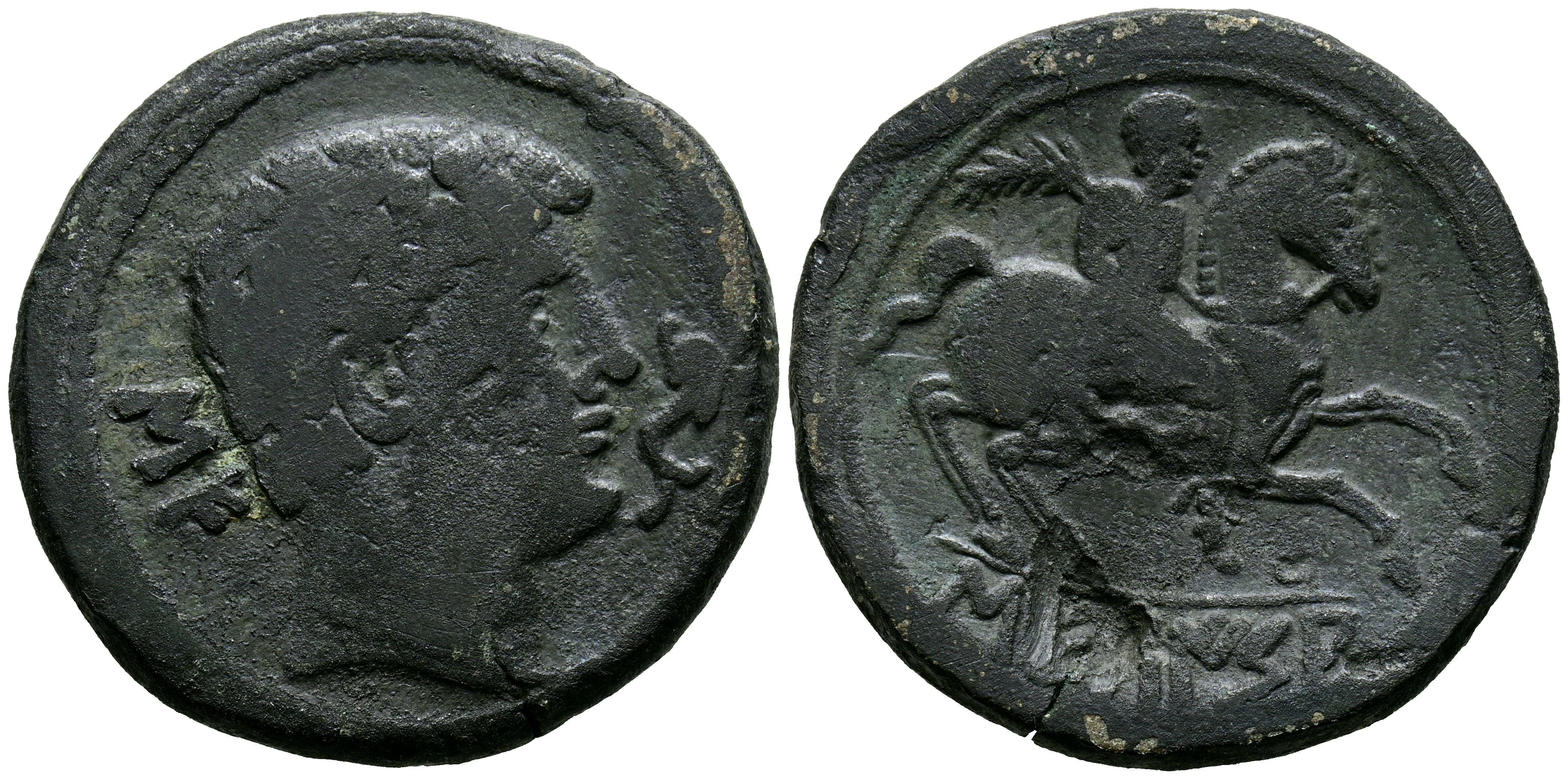 SECAISA (Segeda, Zaragoza). As. (Ae. 18.94g/32mm). 120-20 Fine (FAB-2121). Obv: Male head facing right, with Iberian letters SE behind, dolphin in front. Rev: Horseman with palm facing right, with Iberian legend SECaISA below. VF-. Cleaned.