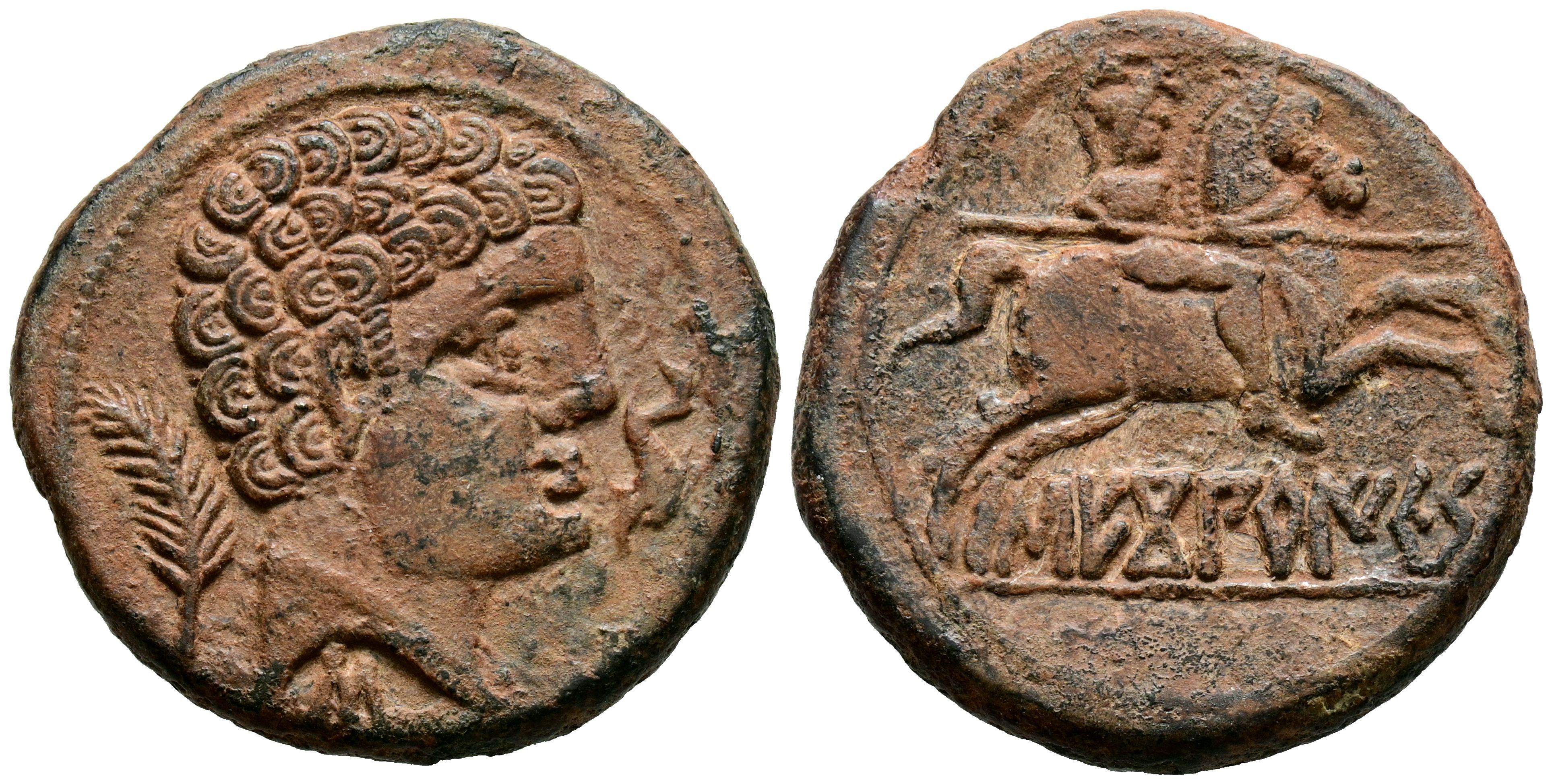 English SECOBIRICES (Saelices, Cuenca). As. (Ae. 12.38g/27mm). 120-30 Fine (FAB-2176). Obv: Male head facing right, dolphin in front, palm tree behind, Iberian letter S below. Rev: Horseman with lance facing right, Iberian legend on a line below: SECoBiRICES. VF+. Revised fields.