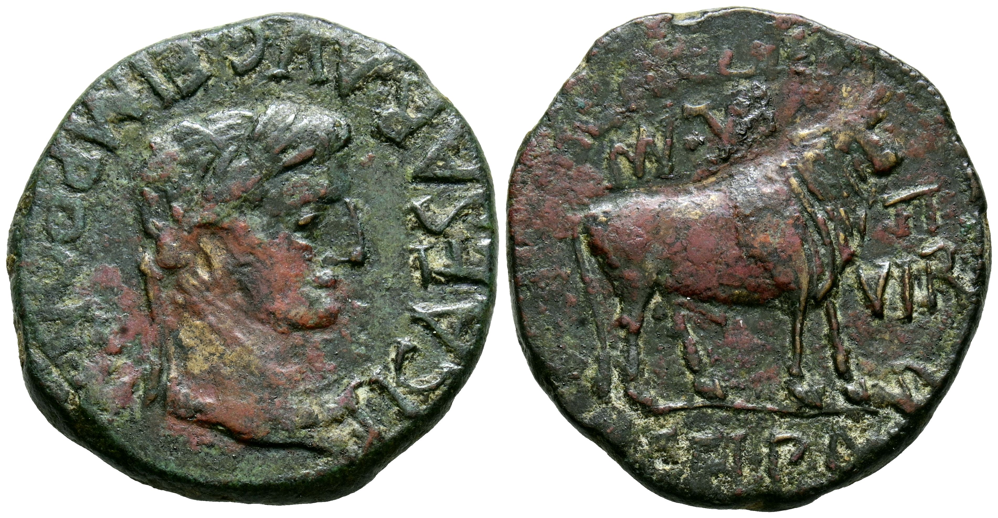 English TURIASO (Tarazona, Zaragoza). As. (Ae. 10.88g/28mm). 14-36 AD (FAB-2450). Obv: Laureate head of Tiberius facing right, around the legend: TI CAESAR AVG F IMP PONT M. Rev: Bull above a line, above: MVN TVR, in front: II VIR, around the legend: M PONT MARSO C MARI VEGETO. VF-.