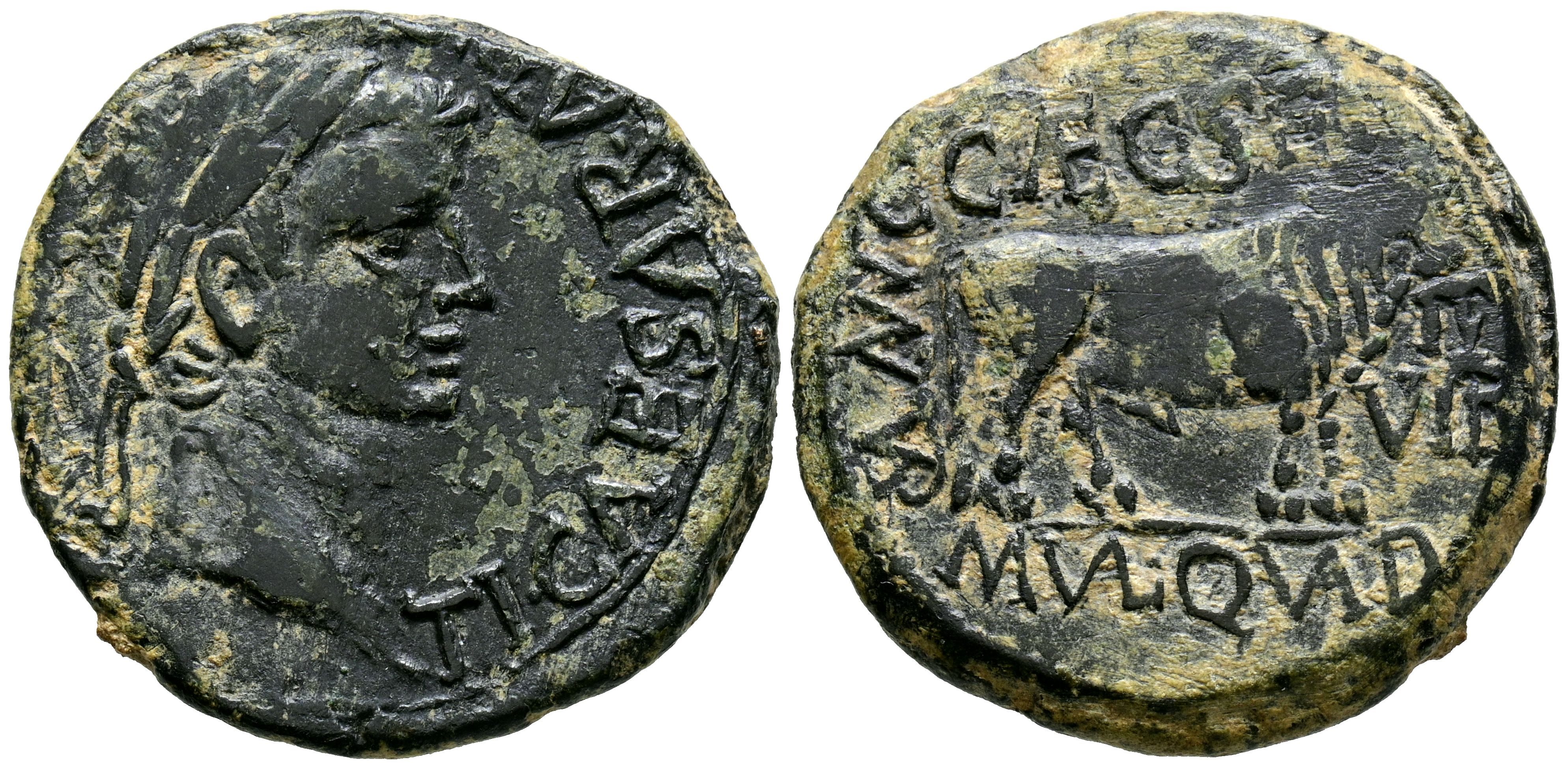 TURIASO (Tarazona, Zaragoza). As. (Ae. 12.46g/28mm). 14-36 AD (FAB-2452). Obv: Laureate head of Tiberius facing right, surrounding legend: TI CAESAR AVGVST F IMPERAT. Rev: Bull facing right, above: C CAEC SER, below: M VAL QVAD, on the sides: MVN TVR-II VIR. VF.