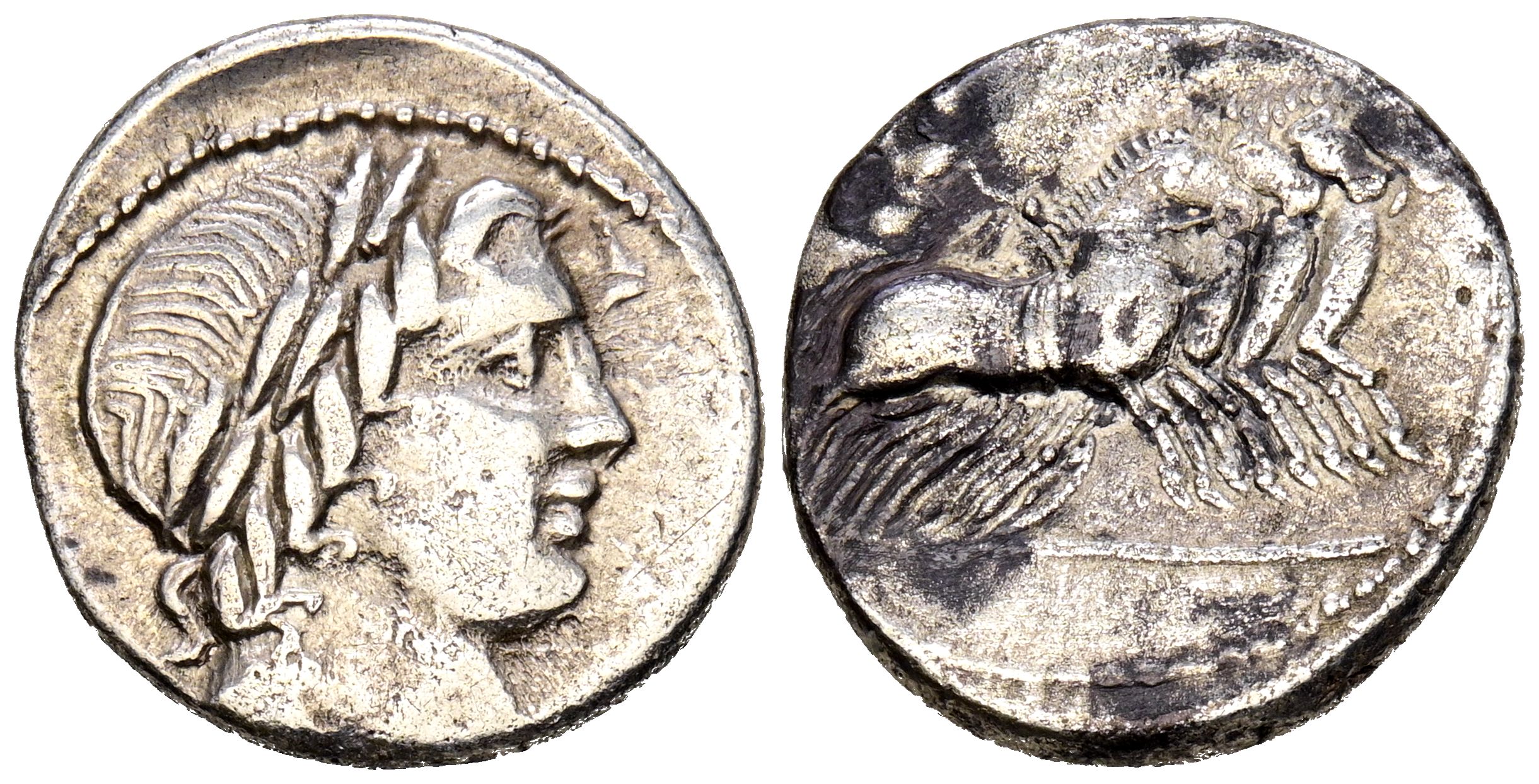 English ANONYMOUS COINAGE. Denarius. (Ar. 3.46g/18mm). 86 Fine Rome. (FFC 85; Crawford 350/A2). Obv: Male head facing right, with a bundle of rays below. Rev: Jupiter with a thunderbolt on a quadriga facing right. VF.