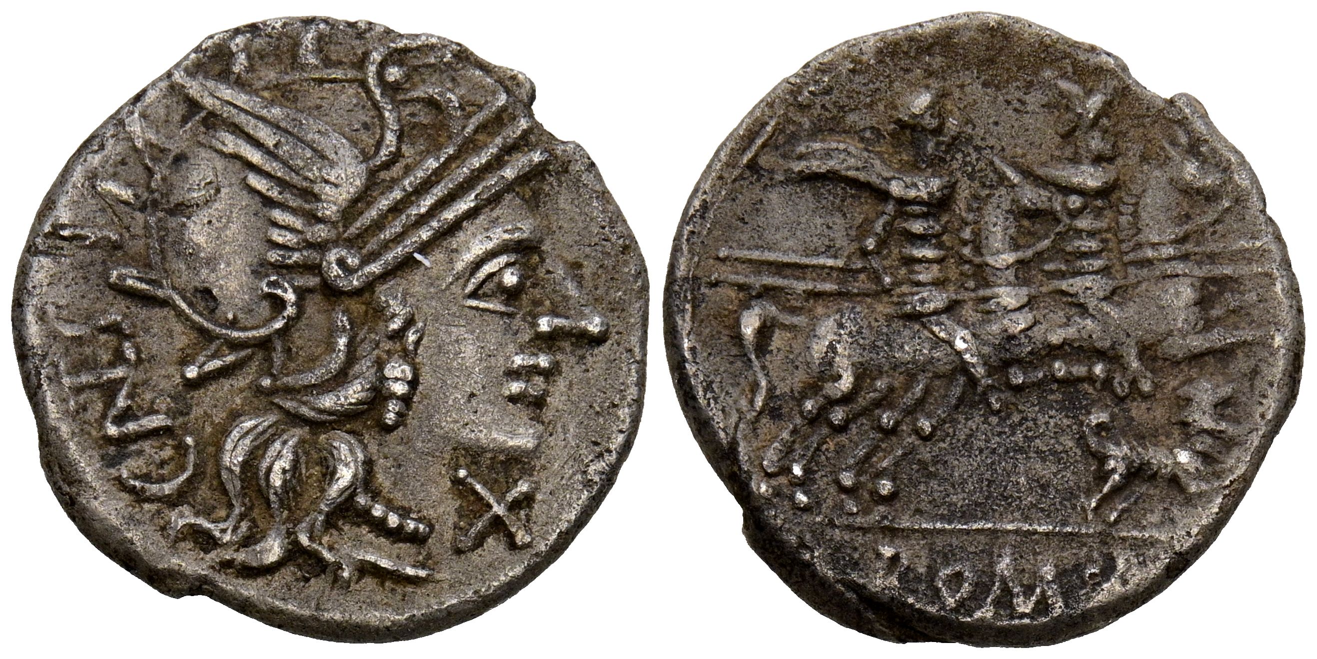 GENS ANTESTIA. Denarius. (Ar. 3.08g/18mm). 146 Fine. Auxiliary workshop in Rome. (FFC 147; Crawford 219/1e). Obv: Head of Rome facing right, X in front, legend C ANTESTI behind. Rev: The Dioscuri on horseback facing right, stars above, dog below, in exergue: ROMA. VF/VF-.