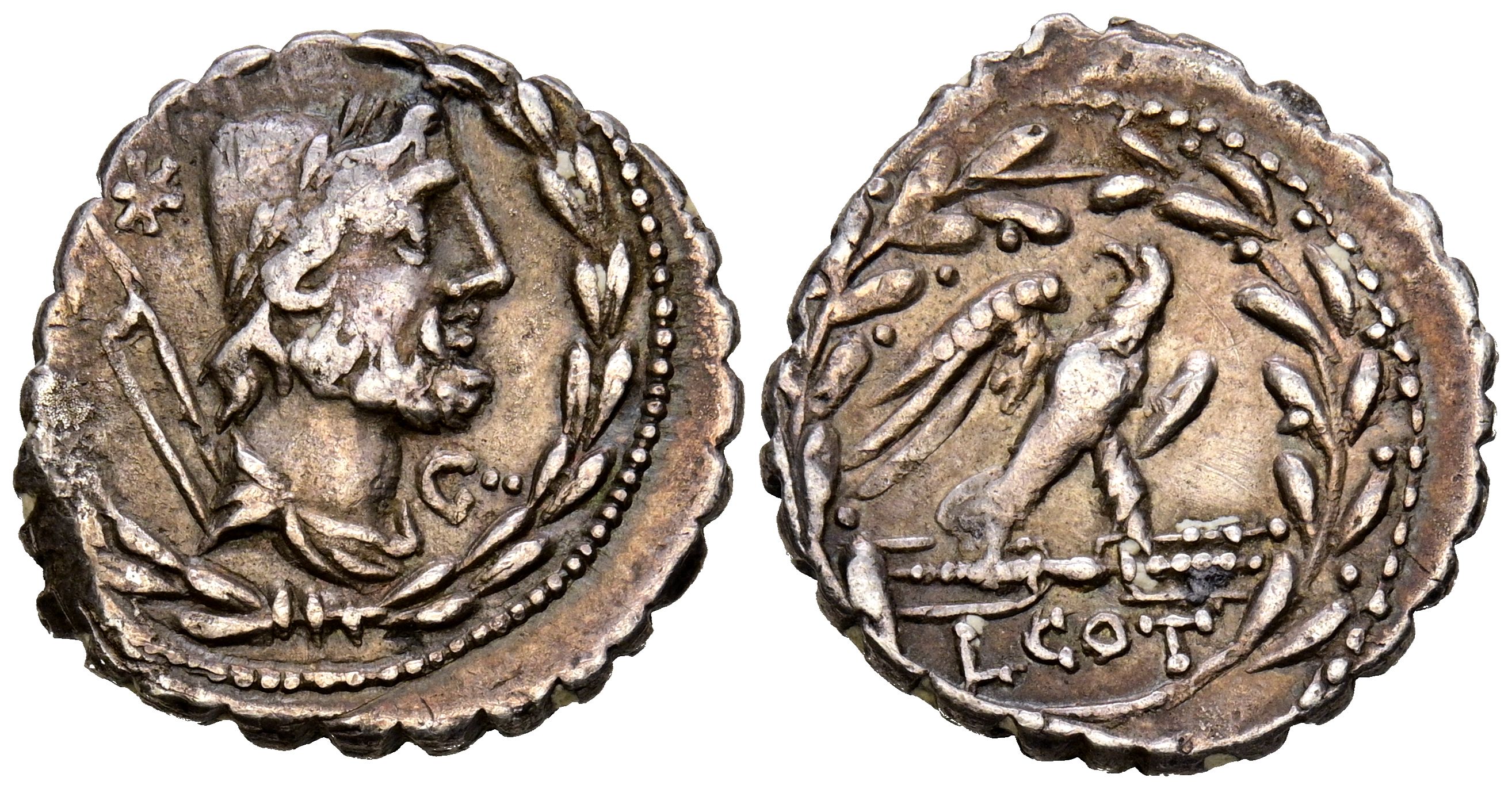 GENS AURELIA. Denarius. (Ar. 3.82g/19mm). 105 Fine Rome. (FFC 188; Crawford 314/1d). Obv: Bust of Vulcan facing right, letter G below the chin, pincers and star behind, all within a laurel wreath. Rev: Eagle facing right on a bundle of rays, in exergue: L COT, all within a laurel wreath. VF+. Displaced minting.