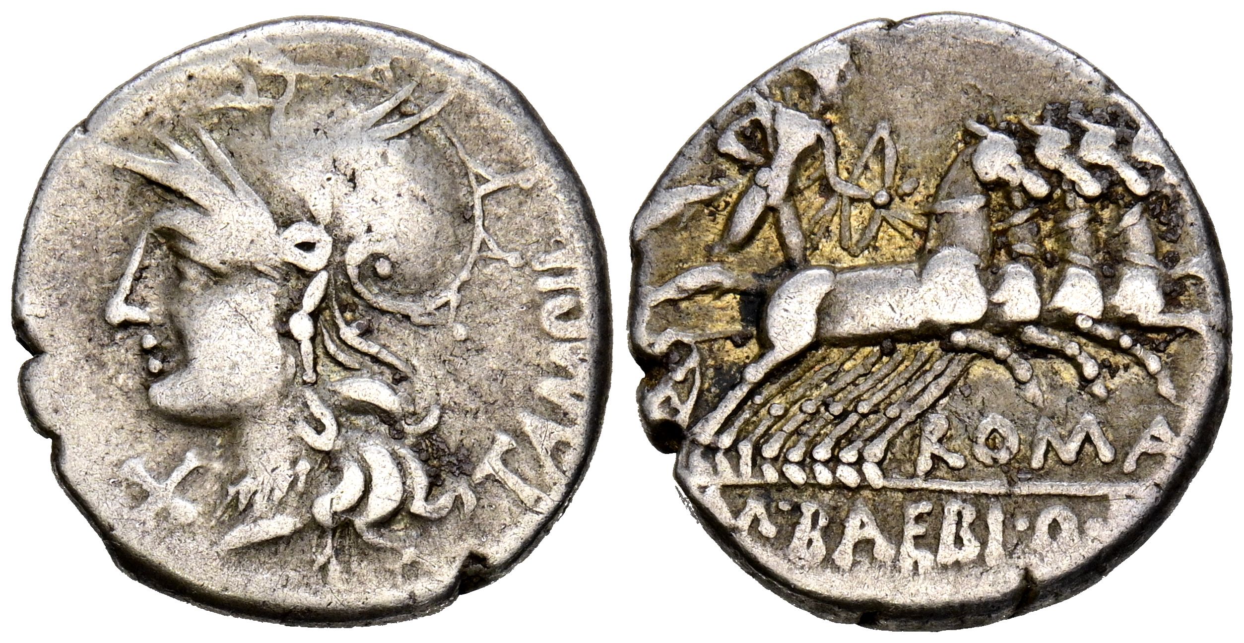 GENS BAEBIA. Denarius. (Ar. 3.78g/18mm). 137 Fine Rome. (FFC 198; Crawford 236/1a). Obv: Head of Rome facing left, front X, behind legend: TAMPIL. Rev: Apollo with palm tree, bow and arrows driving a quadriga facing right, below legend: ROME, in exergue: M BAEBI QF. VF-/VF.