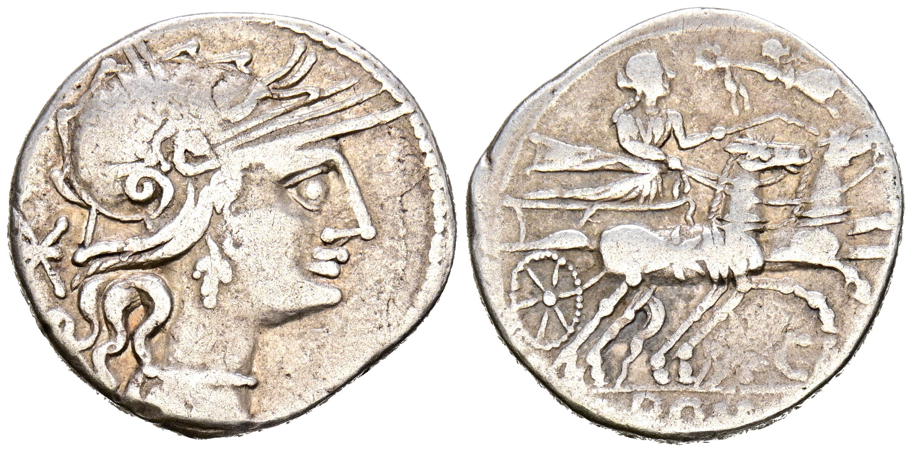 GENS CALPURNIA. Denarius. (Ar. 3.78g/20mm). 133 Fine (FFC 225; Crawford 247/1). Obv: Head of Rome facing right, star behind. Rev: Woman with whip on biga facing right, crowned by Victory flying left, legend below: P CALP, epigraph: ROMA. VF.