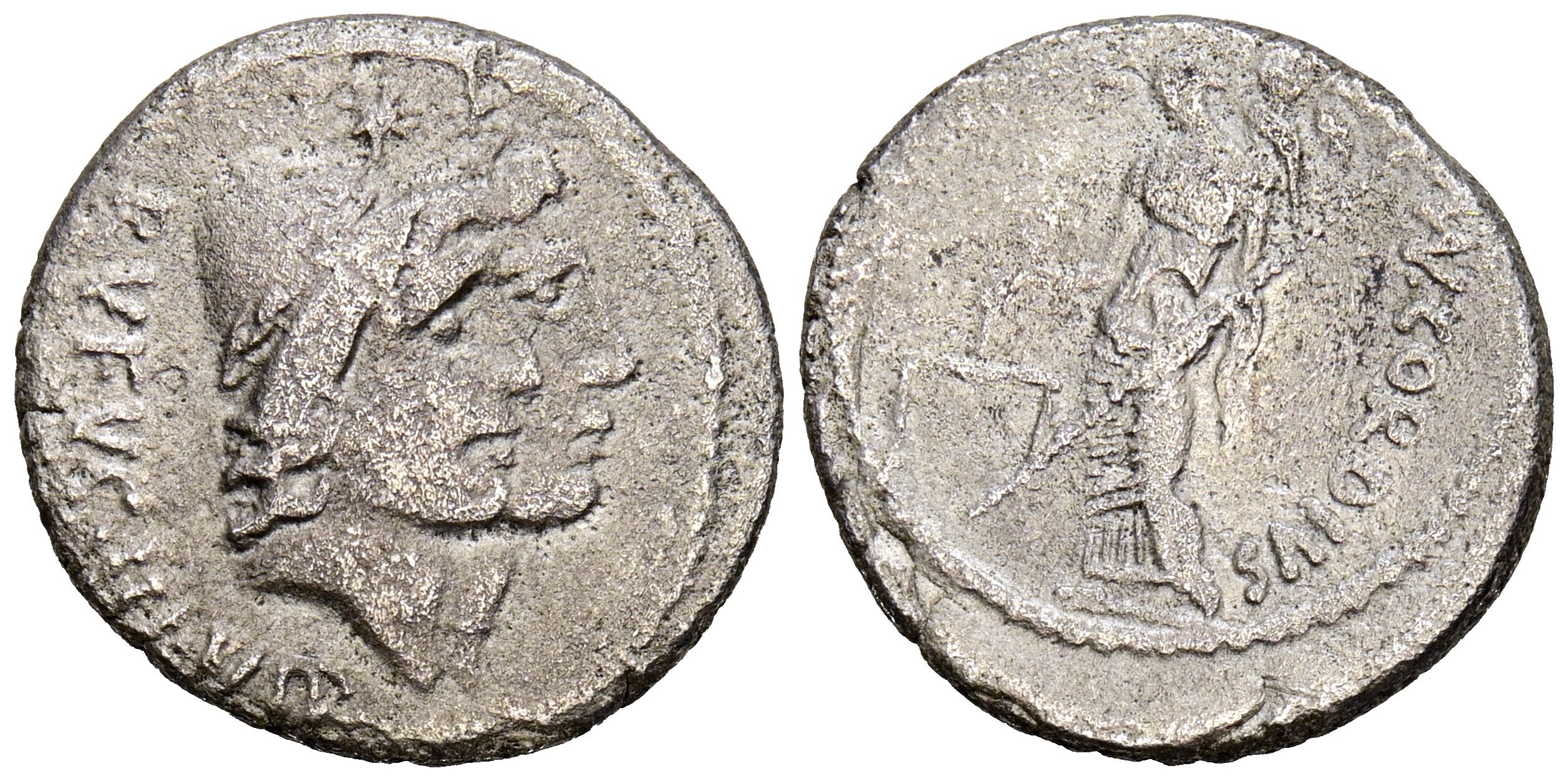 GENS CORDIA. Denarius. (Ar. 3.40g/18mm). 46 Fine Rome. (FFC 602; Crawford 463/1b). Obv: Diademed heads of the Dioscuri facing right, stars above, legend behind: RVFVS III VIR. Rev: Venus Verticordia standing left holding scales and sceptre, with a cupid behind her, legend behind: MN CORDIVS. VF-.