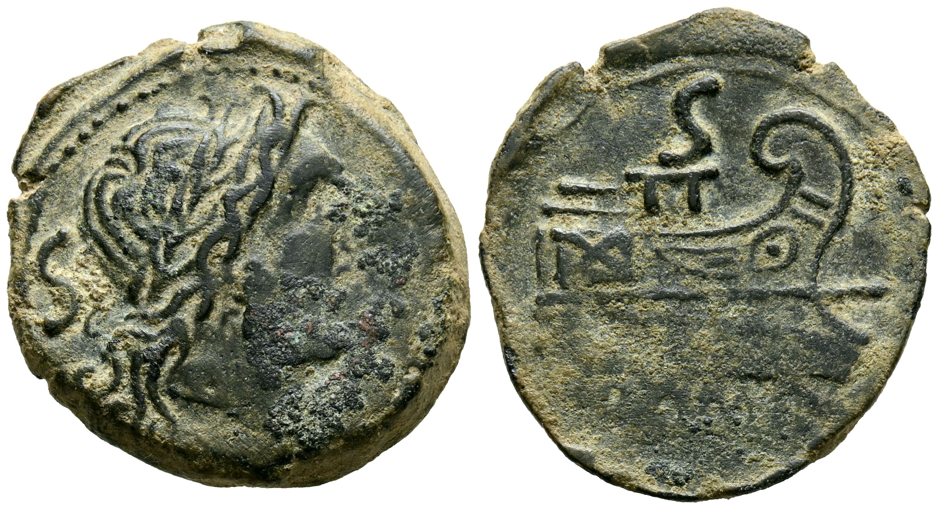 GENS CORNELIA. Semis. (Ae. 7.30g/24mm). 169-158 Fine (Crawford 189/2). Obv: Laureate head of Saturn facing right, S behind. Rev: Prow facing right, legend above: P BLAS, front: S, legend below: ROMA. VF-.
