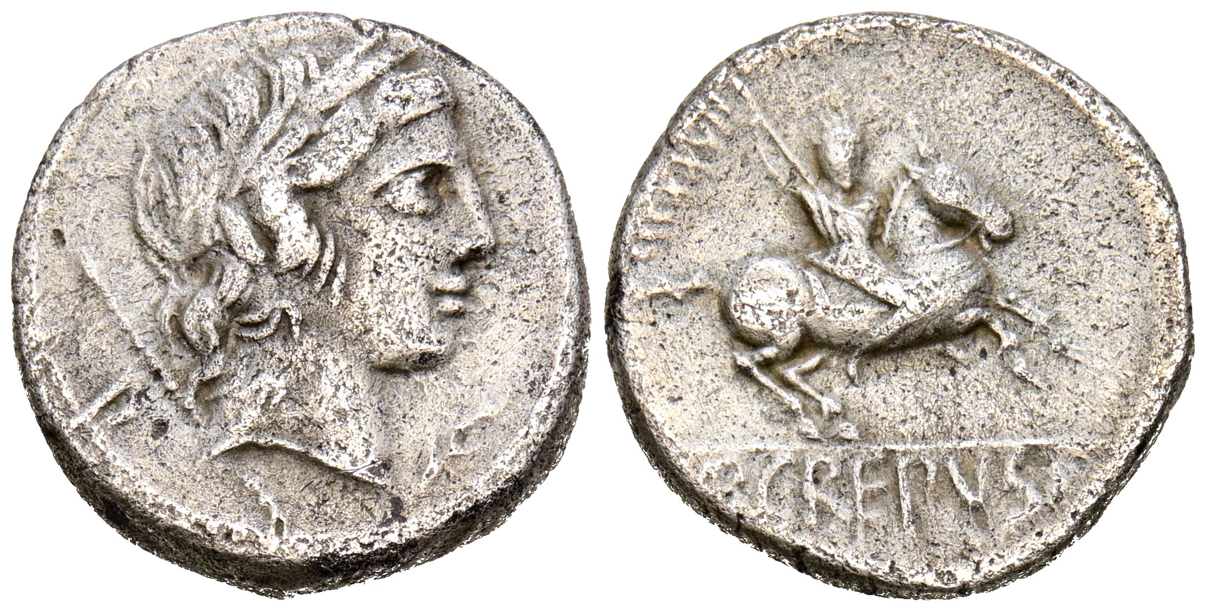 English GENS CREPUSIA. Denarius. (Ar. 3.48g/17mm). 82 Fine (FFC 659; Crawford 361/1c). Obv: Laureate head of Apollo facing right, behind: symbol. Rev: Horseman riding to the right brandishing a short spear, behind: number, in epigraph: P CREPVSI. VF.
