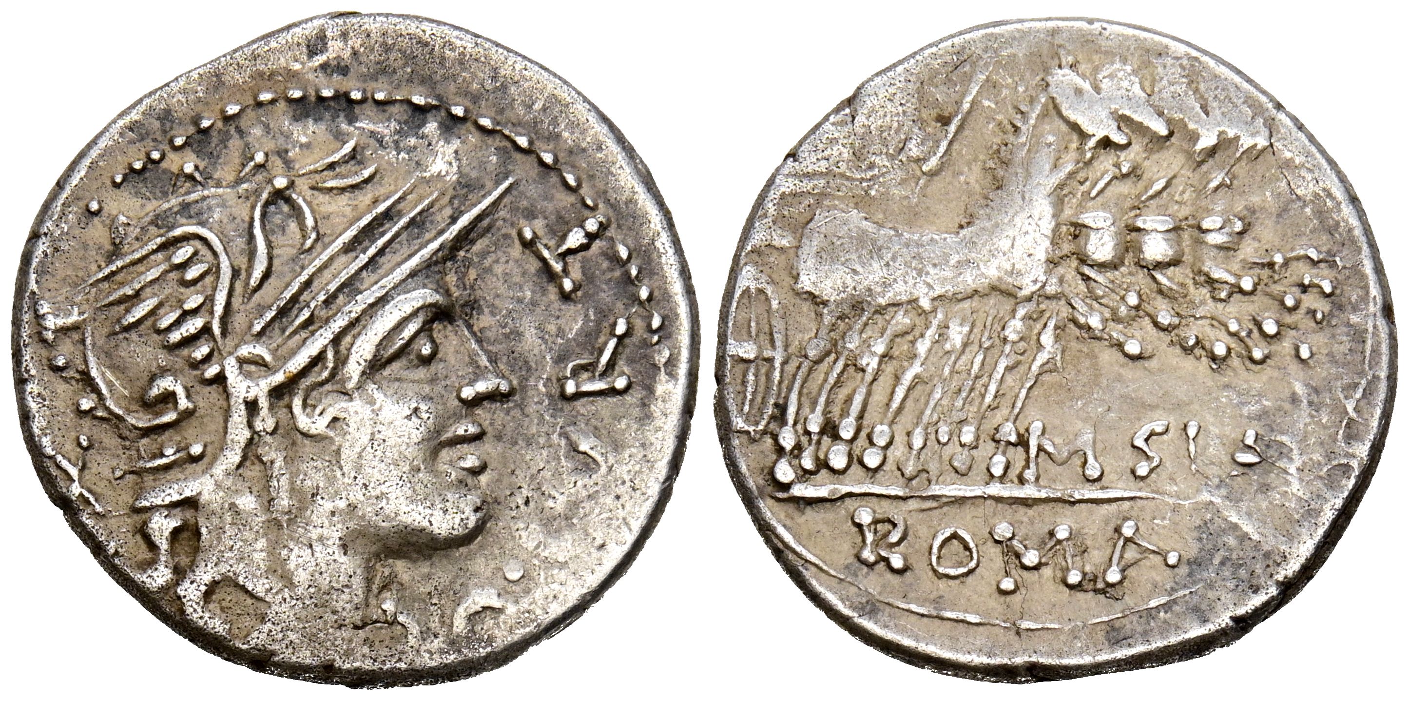 English GENS CURTIA. Denarius. (Ar. 3.93g/20mm). 116-115 Fine Northern Italy. (FFC 669; Crawford 285/2). Obv: Head of Roma facing right, behind X, front legend: Q CVRT. Rev: Jupiter driving a quadriga facing right, carrying a sceptre and a bundle of lightning bolts, above a lithuanian, below a legend: M SYLLA, in exergue: ROME. VF.