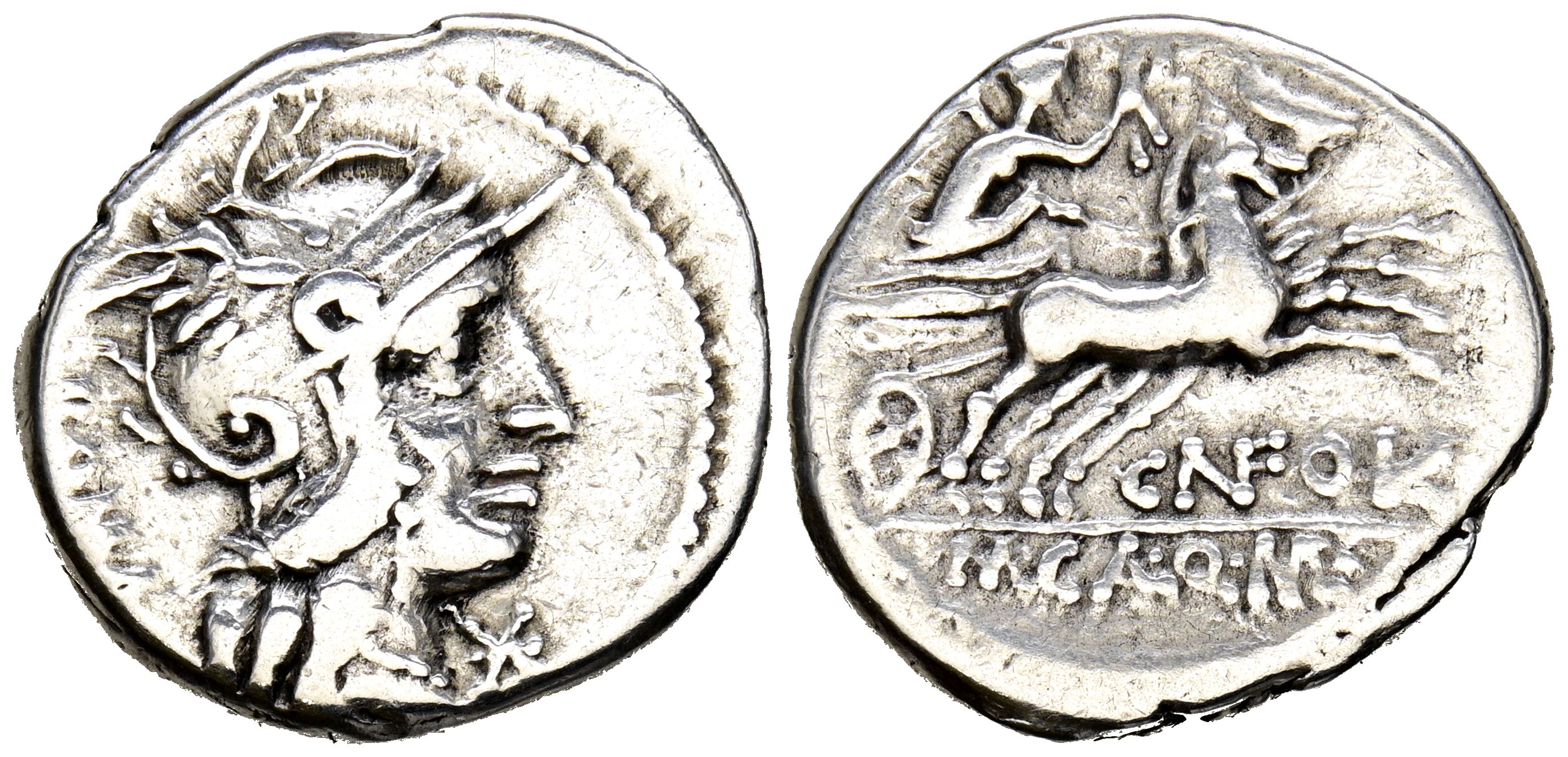GENS FULVIA. Denarius. (Ar. 3.66g/20mm). 117-111 Fine Northern Italy. (Crawford 284/1b; FFC 726). Obv: Head of Rome facing right, star in front, legend behind: ROME. Rev: Victory with laurel wreath on biga facing right, legend below: CN FOVL, in exergue: M CAL Q MET. VF.