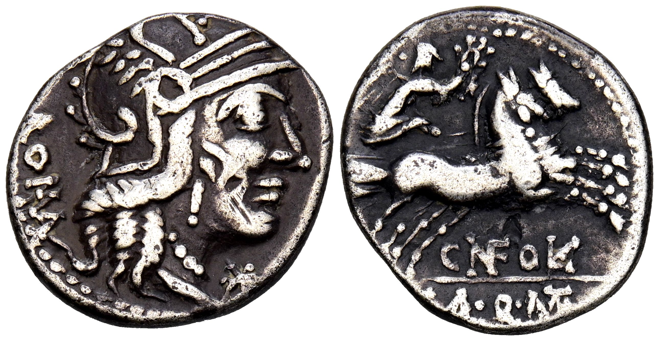 English GENS FULVIA. Denarius. (Ar. 3.83g/19mm). 117-111 Fine Northern Italy. (FFC 726; Crawford 284/1b). Obv: Head of Rome right, star in front, legend behind: ROME. Rev: Victory with laurel wreath on biga right, legend below: CN FOVL, in exergue: M CAL Q MET. VF. Cleaned.