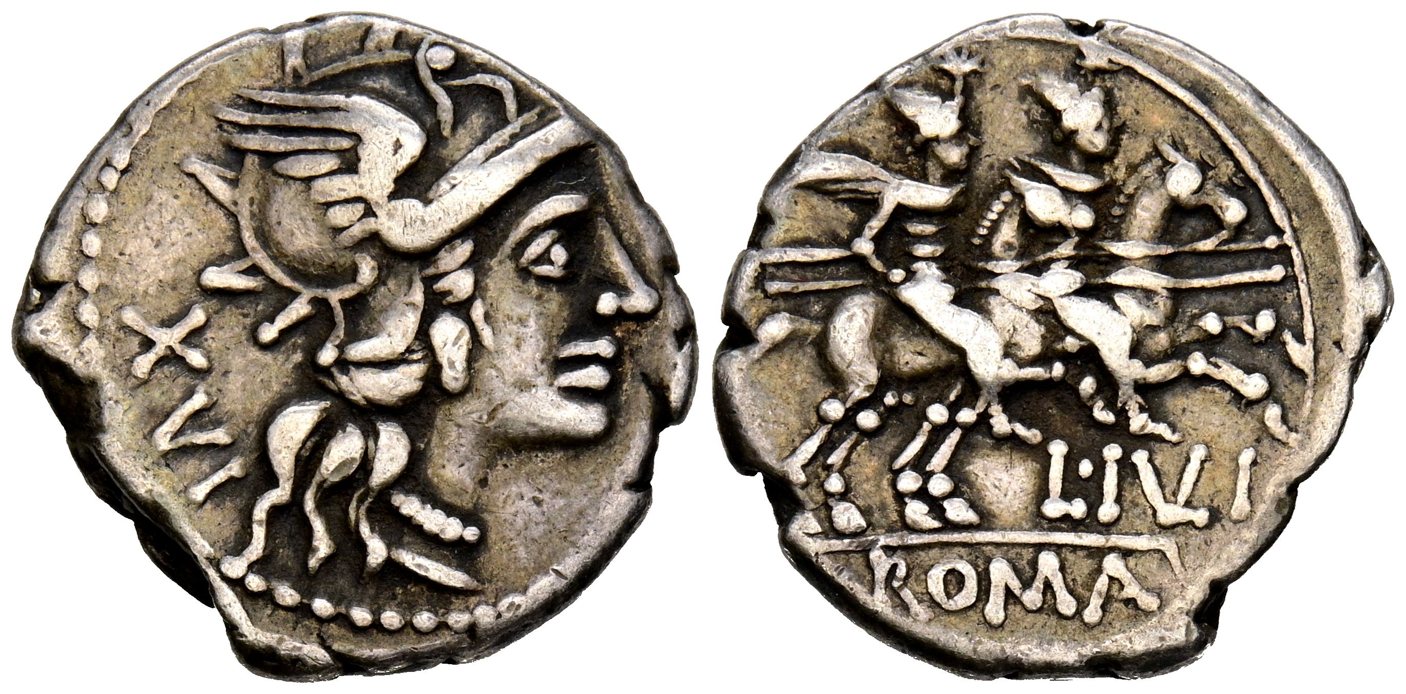 English GENS JULIA. Denarius. (Ar. 3.50g/19mm). 141 Fine Rome. (FFC 760; Crawford 224/1). Obv: Head of Rome facing right, number XVI behind. Rev: Dioscuri facing right with stars above, below: L IVLI, in exergue: ROME. VF.